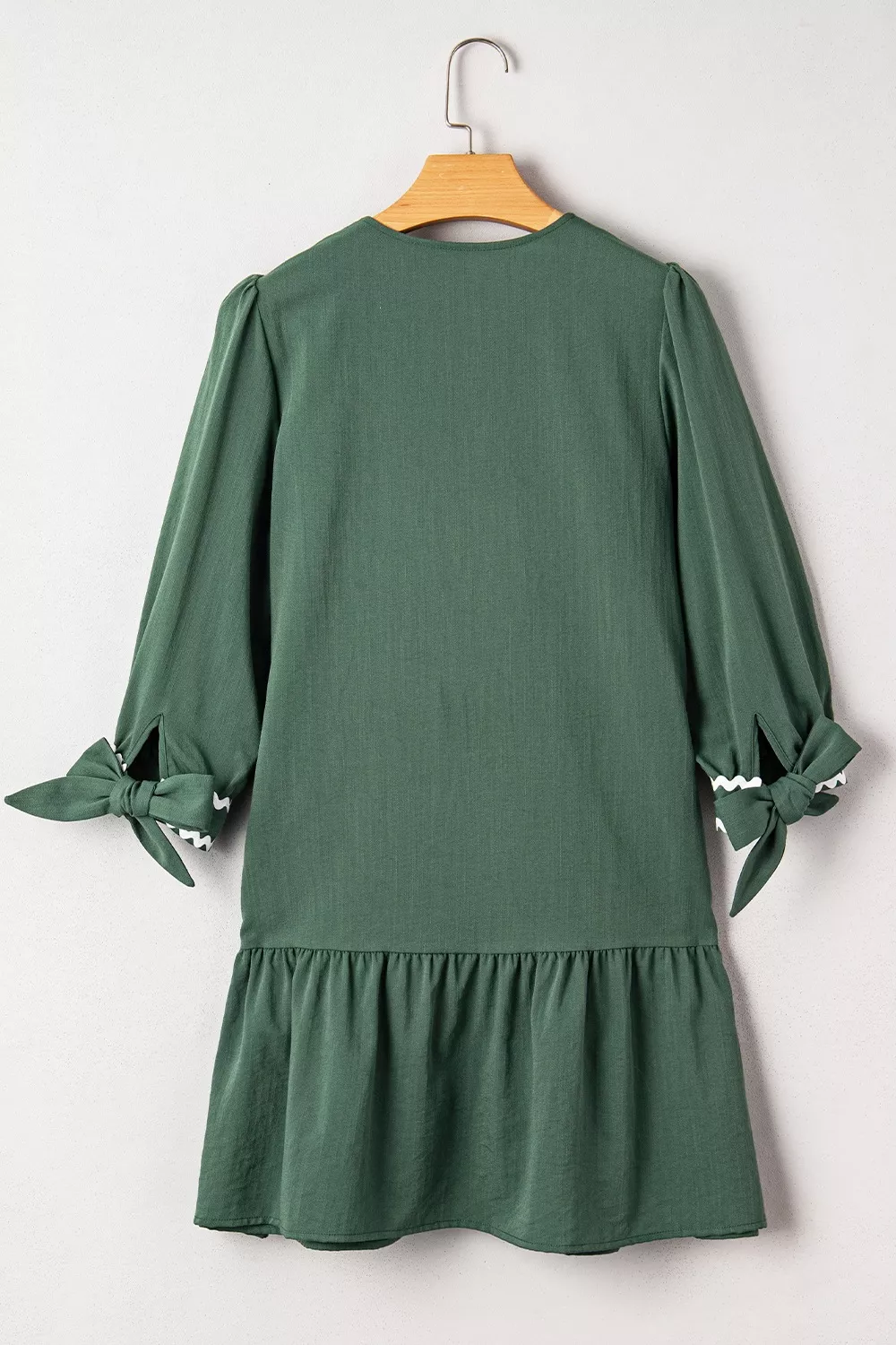 Contrast Ricrac Trim Button V Neck Knotted Bracelet Sleeve Shift Dress