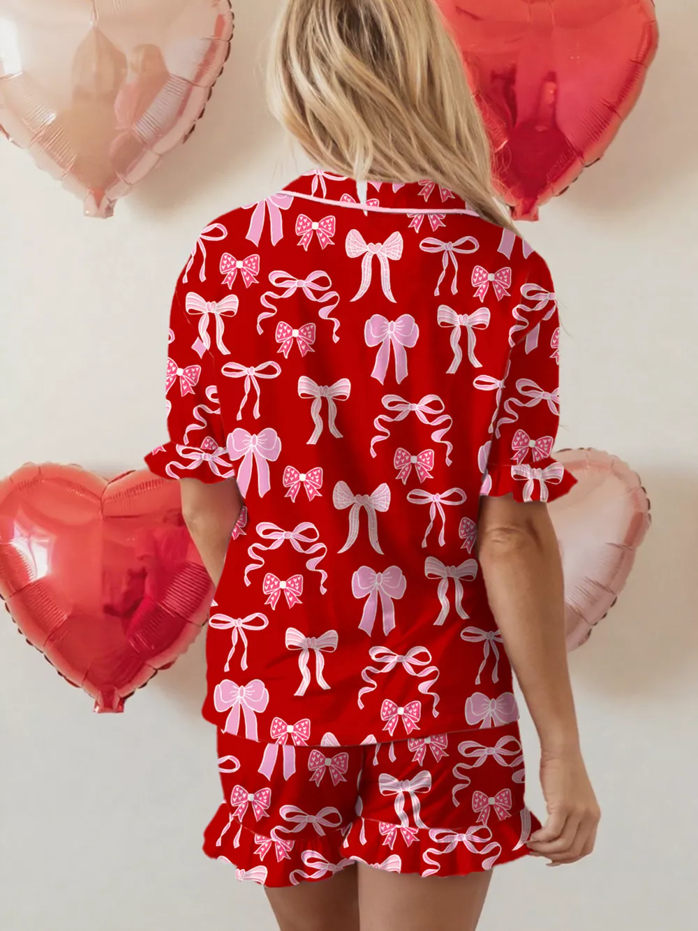 Bow Print Ruffled Short Sleeve Shirt and Shorts 2pcs Pajama Set