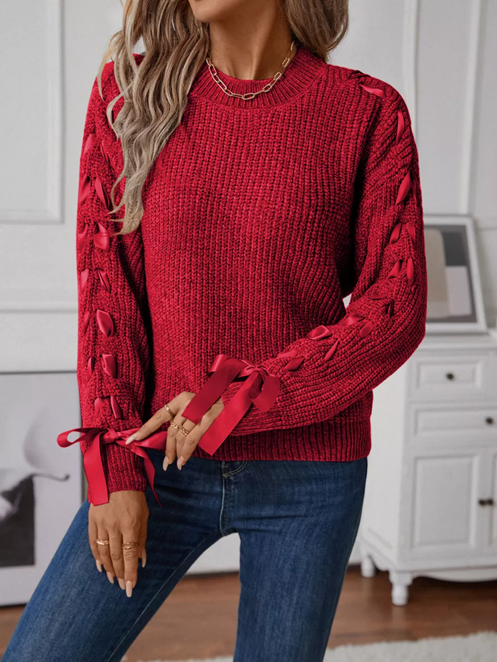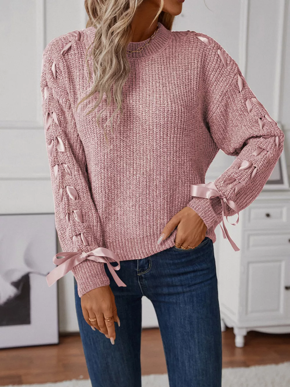 Ribbon-Tie Sleeve Round Neck Sweater
