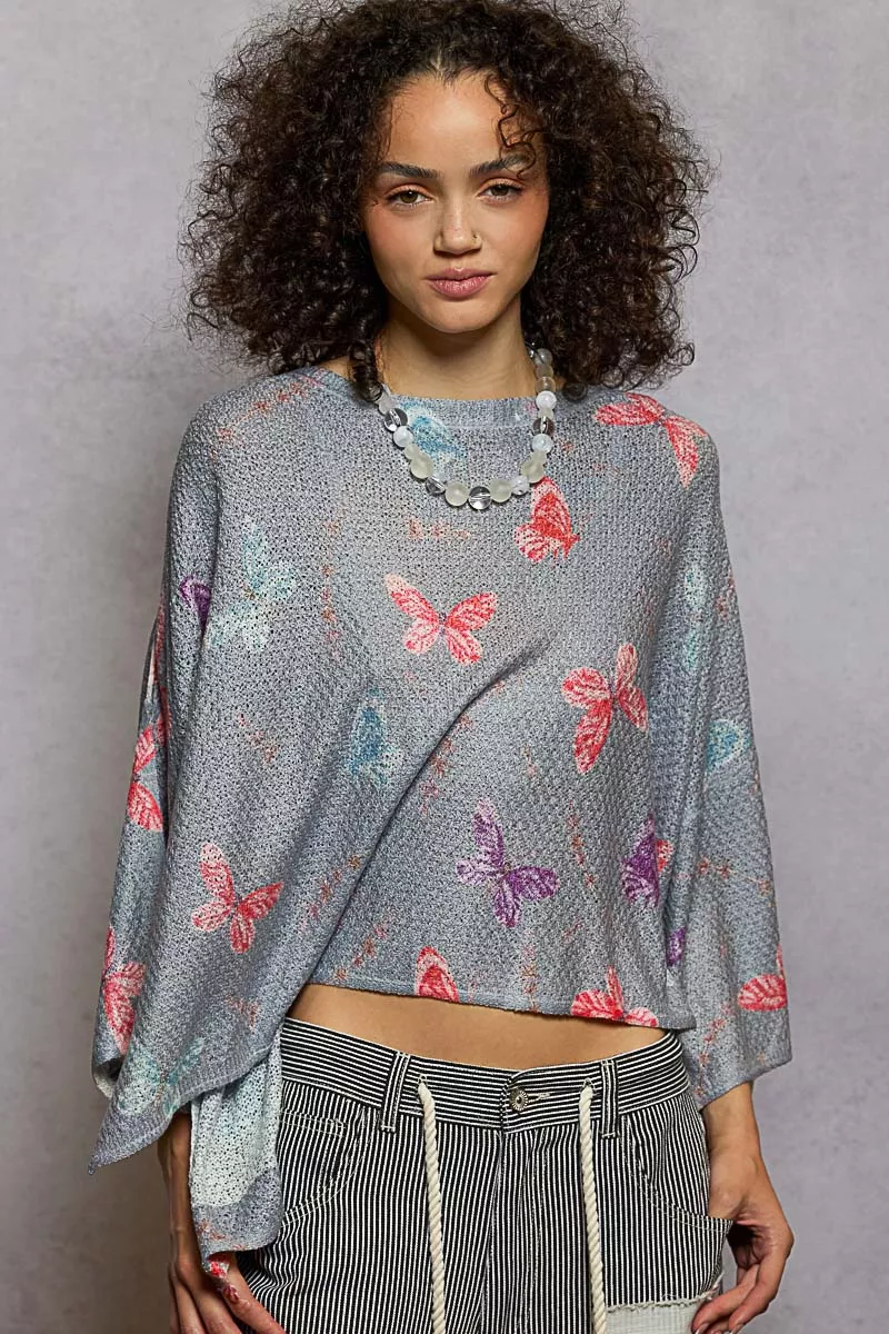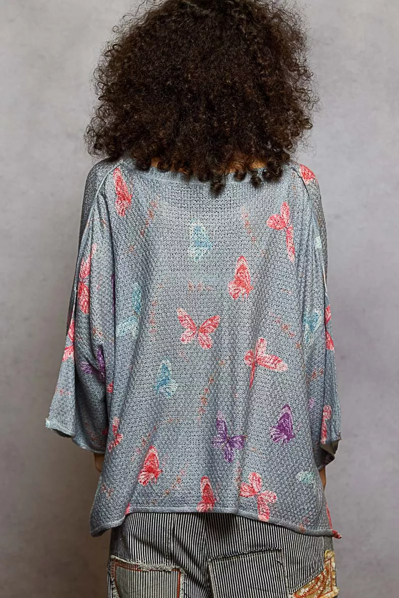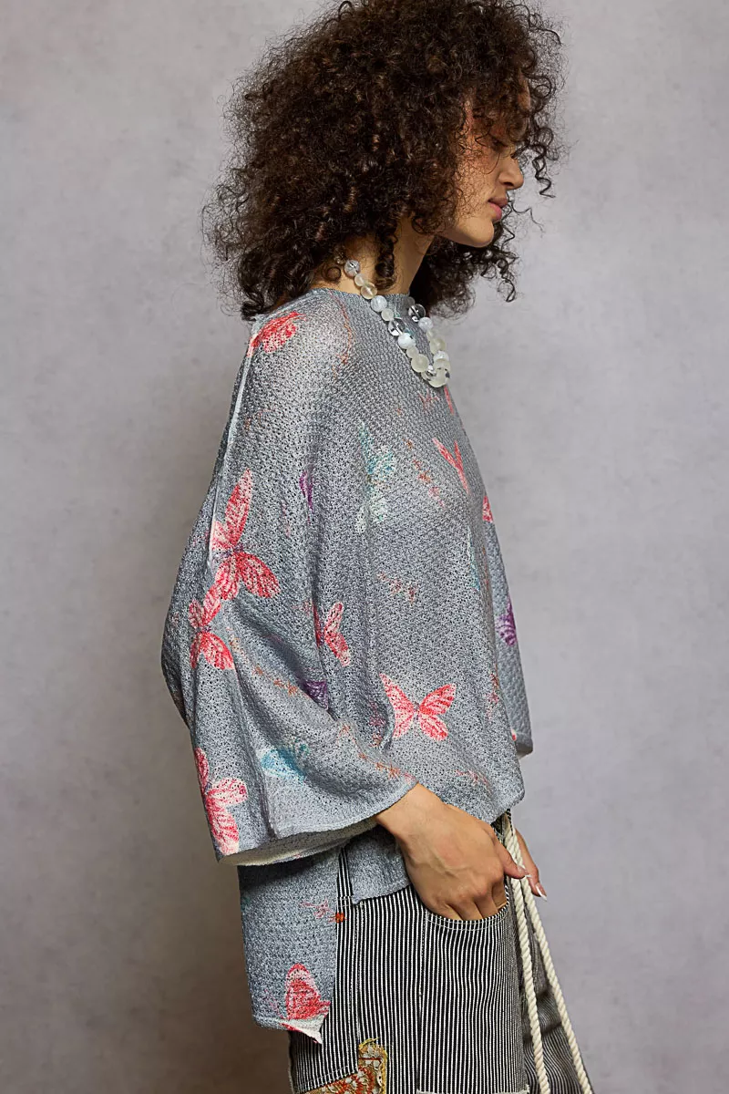 POL Butterflies Pattern Round Neck knit Top with Outseam Rolling Edge