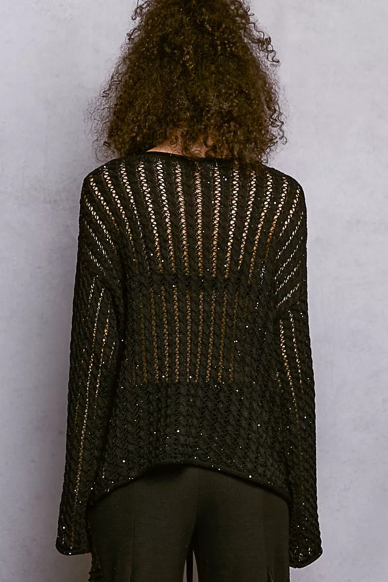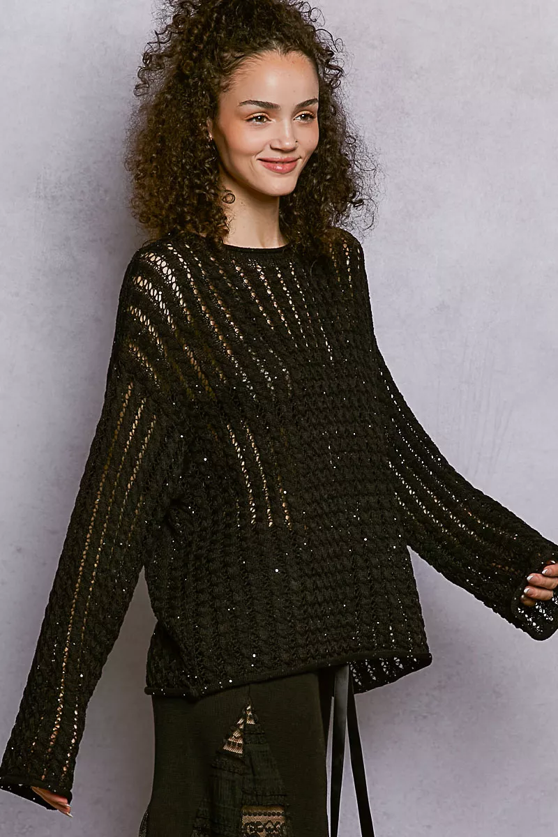 POL Openwork Round Neck Knit Top with Shiny Detail