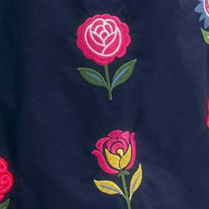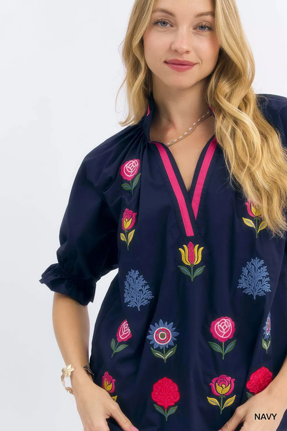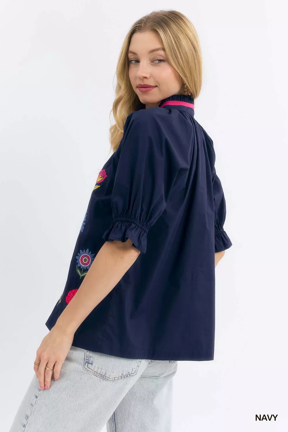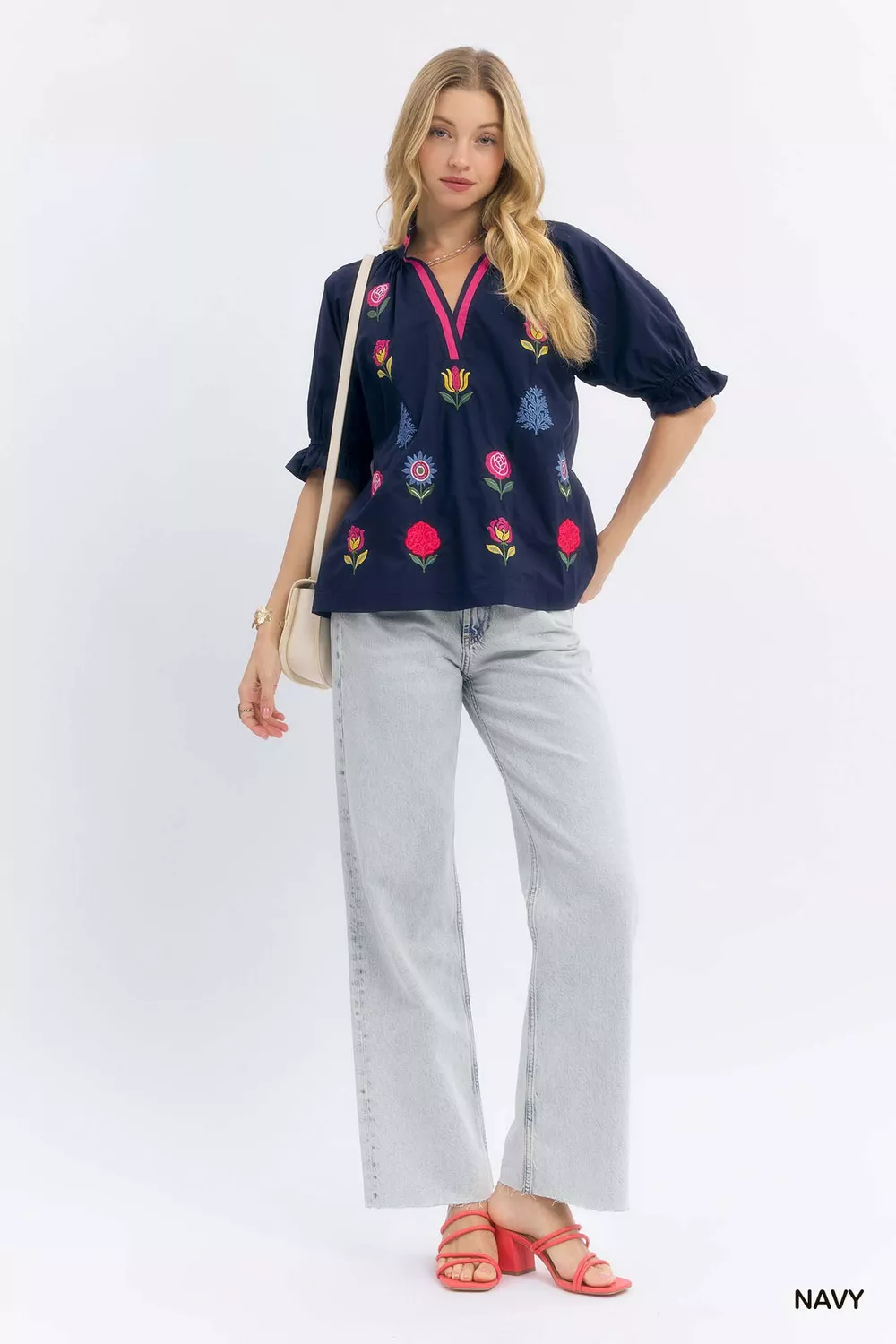 The Embroidered Floral Top is a stunning piece with intricate multicolor floral embroidery. The V-neckline with contrast trim adds a touch of elegance to the top. Short puff sleeves with elastic ruffle cuffs provide a charming and stylish detail. This top is not lined, making it ideal for a lightweight and breathable feel. Elevate your outfit with this beautifully embroidered top for a chic and feminine look.