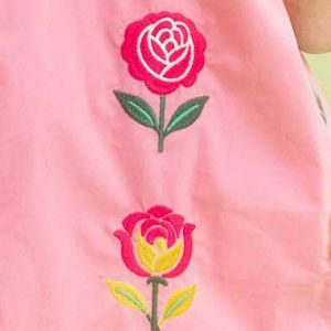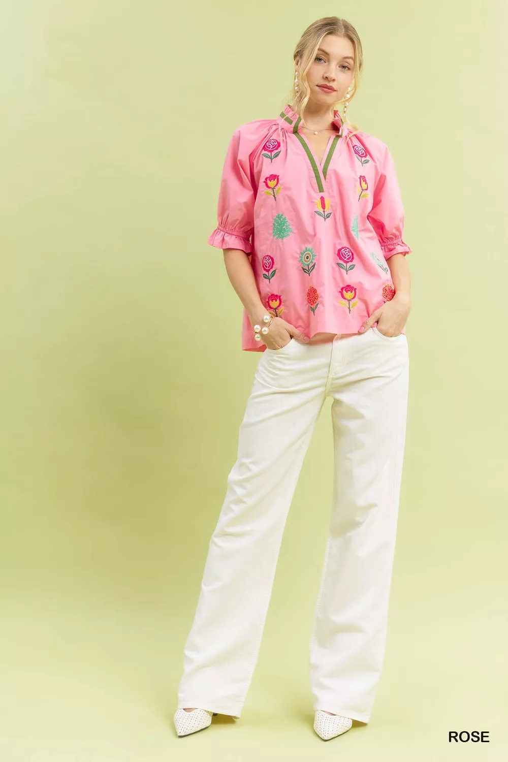 The Embroidered Floral Top is a stunning piece with intricate multicolor floral embroidery. The V-neckline with contrast trim adds a touch of elegance to the top. Short puff sleeves with elastic ruffle cuffs provide a charming and stylish detail. This top is not lined, making it ideal for a lightweight and breathable feel. Elevate your outfit with this beautifully embroidered top for a chic and feminine look.