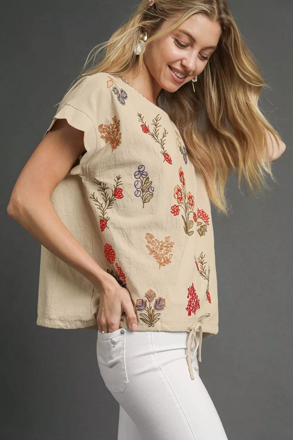 Umgee Embroidered Scallop Sleeve Top with Drawstring Hem