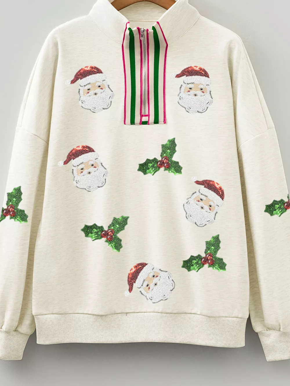 Sequin Santa Christmas Holly Patched Striped Trim Zip V Neck Sweatshirt