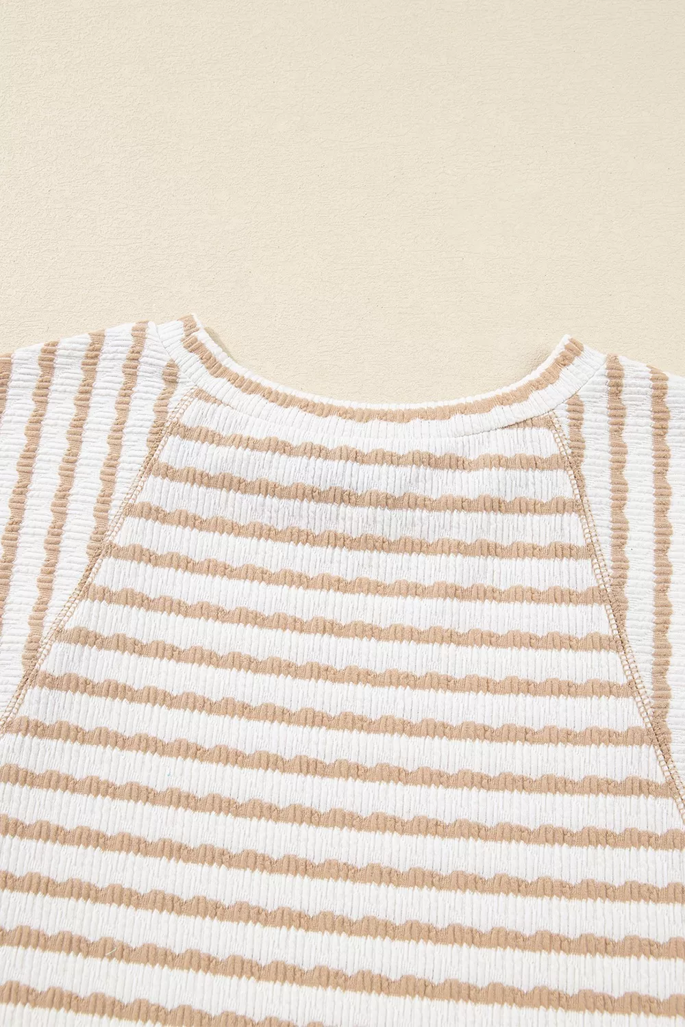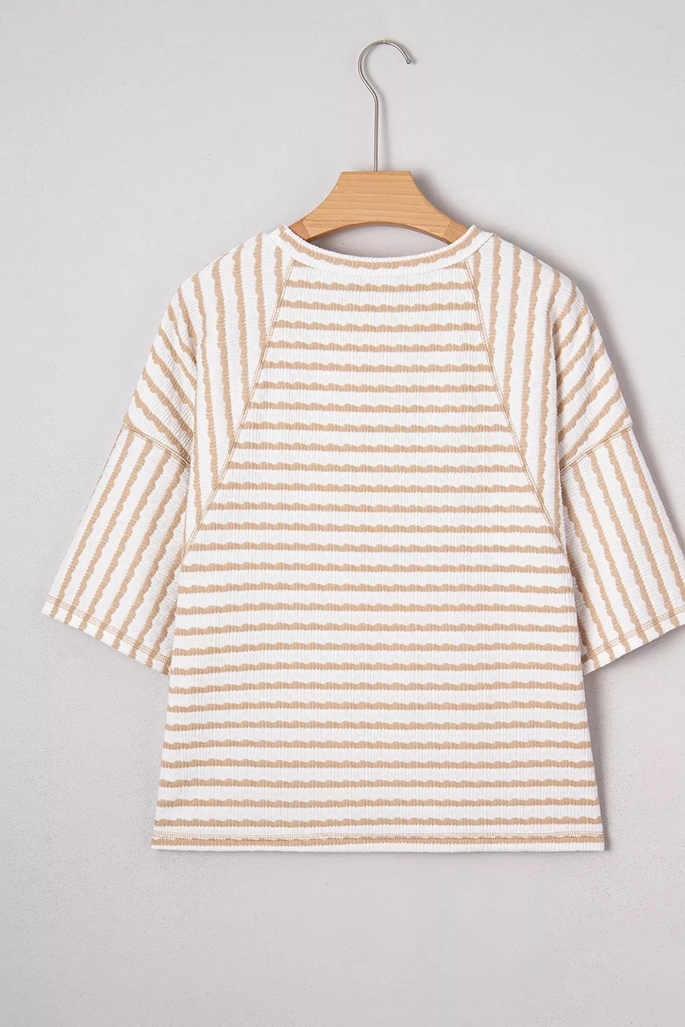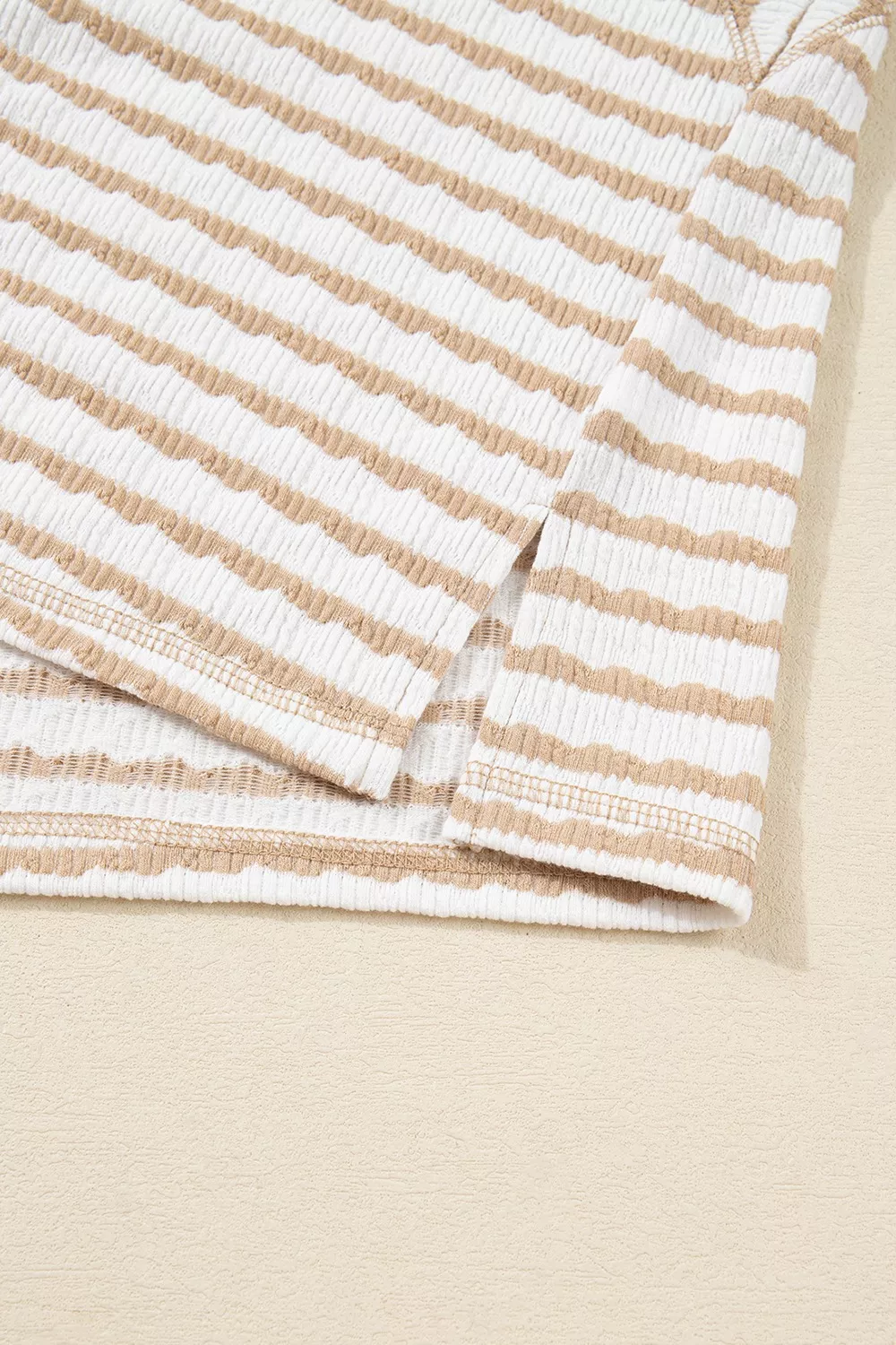 Stripe Textured Knit Split Hem Half Sleeve Loose Top