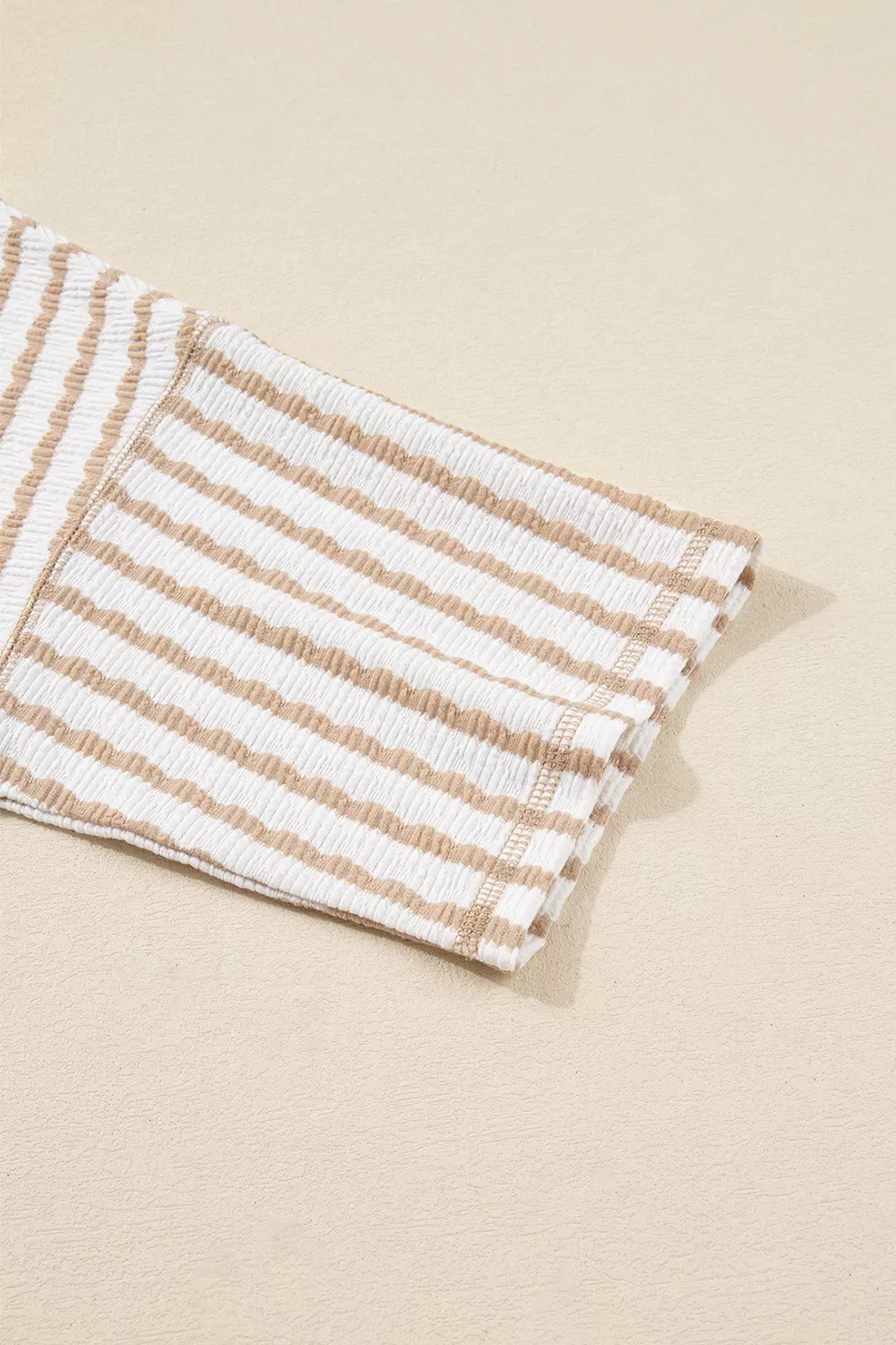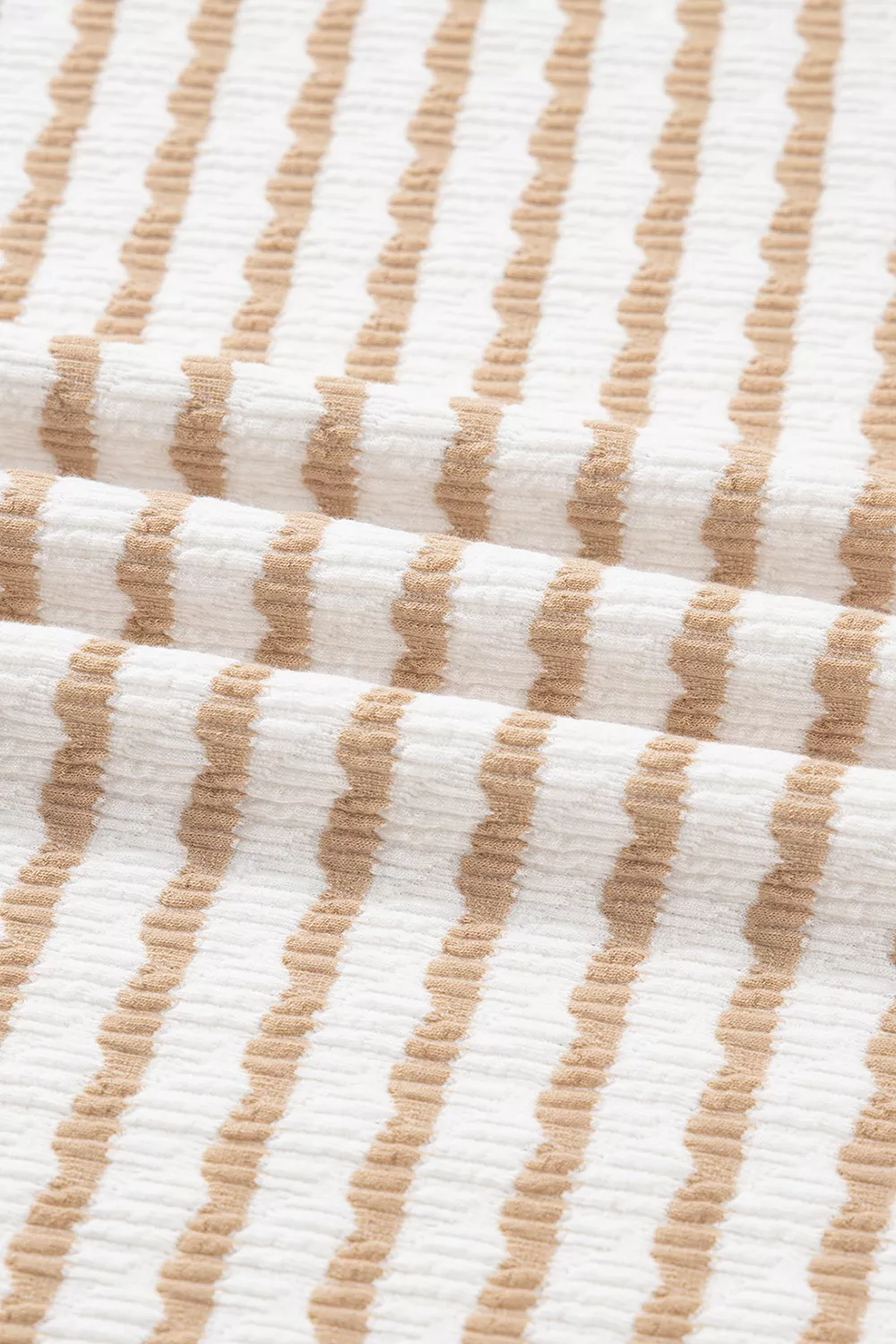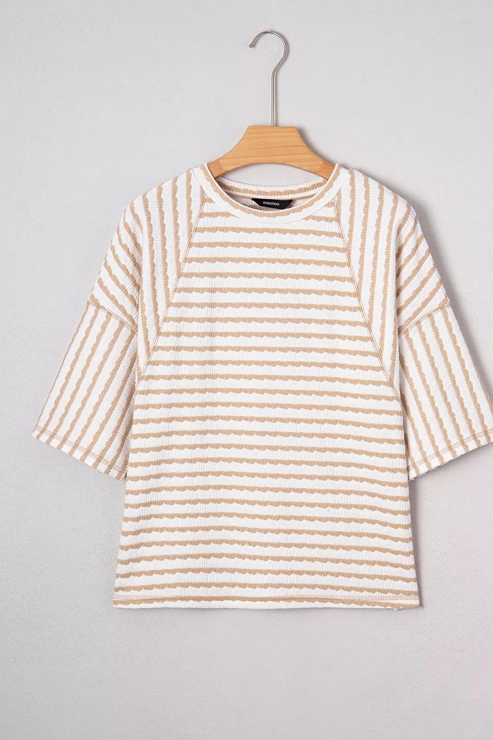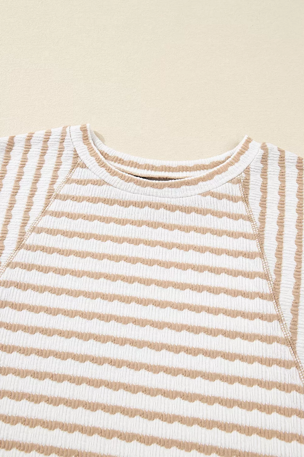 Stripe Textured Knit Split Hem Half Sleeve Loose Top