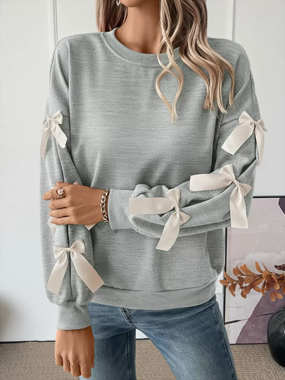 Bowknot Sleeve Round Neck Sweatshirt