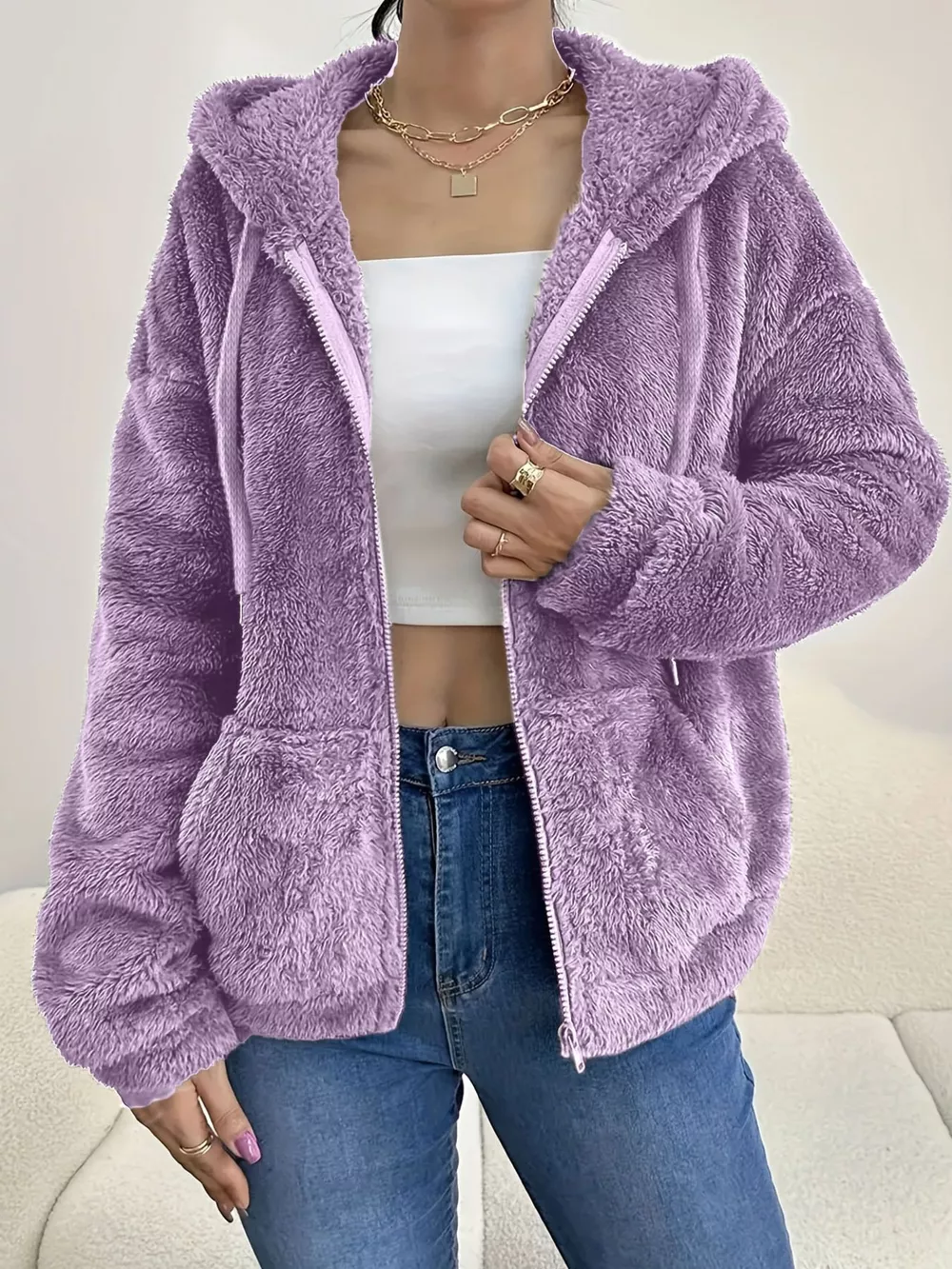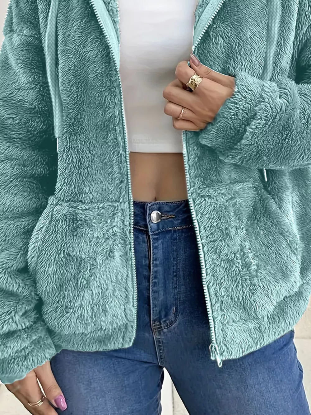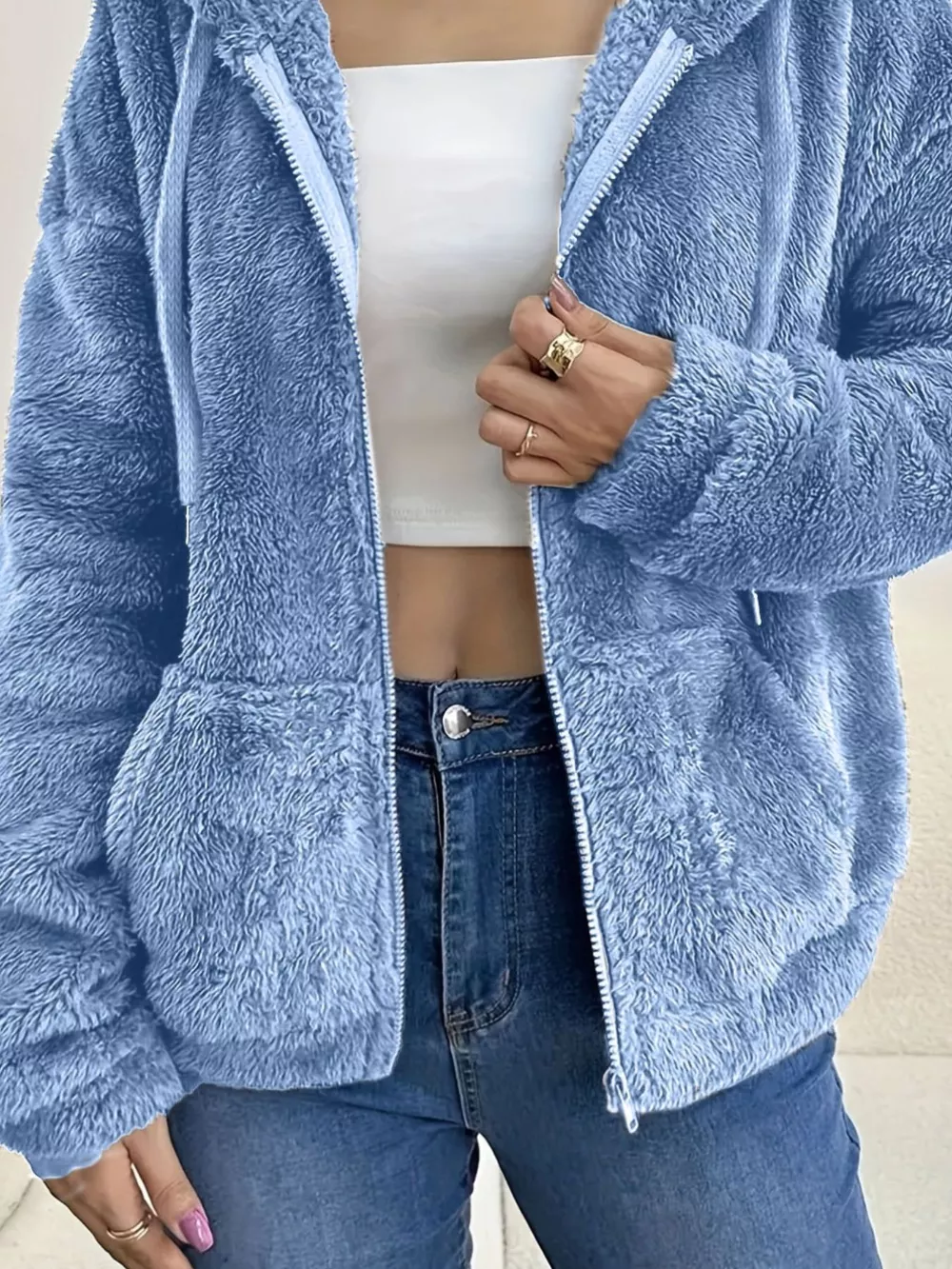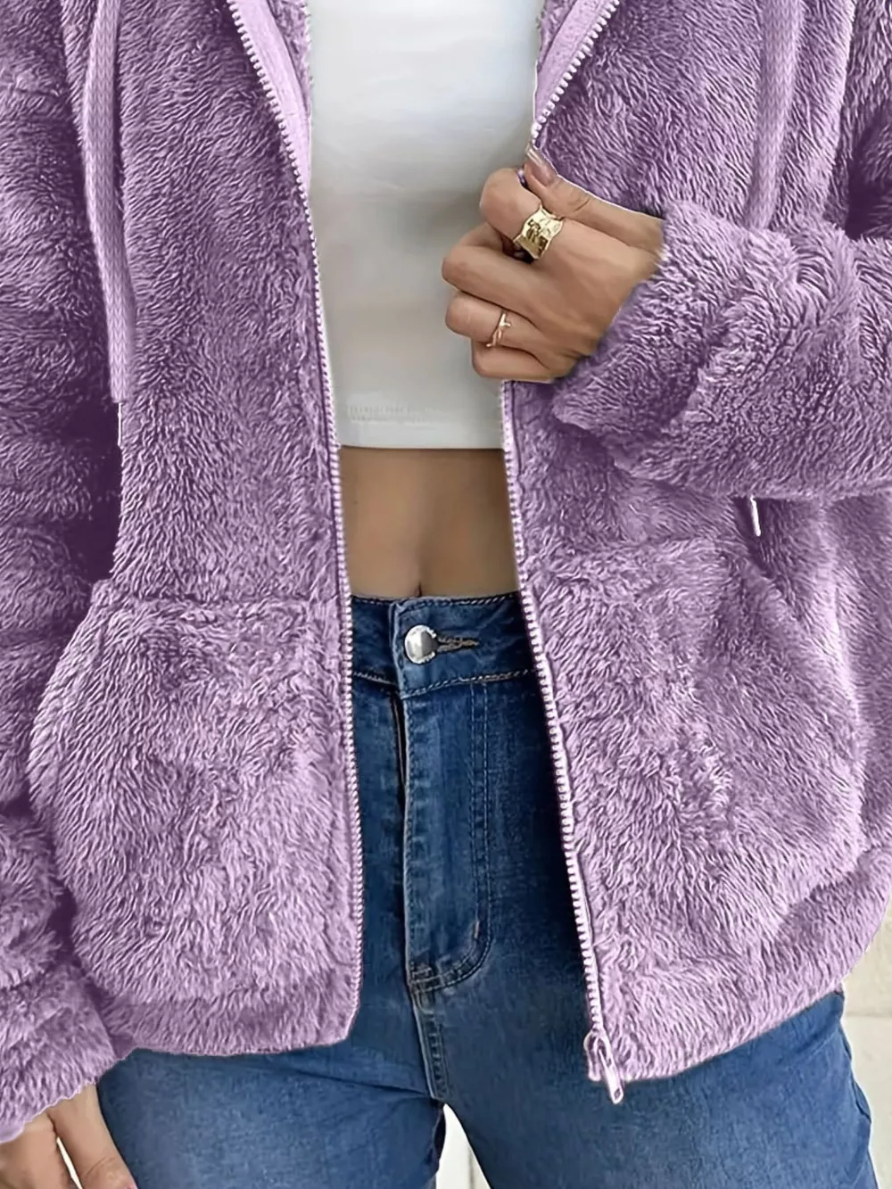Drawstring Fleece Zip-Up Outerwear