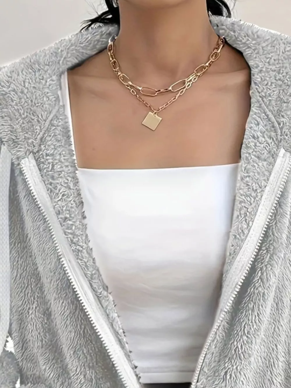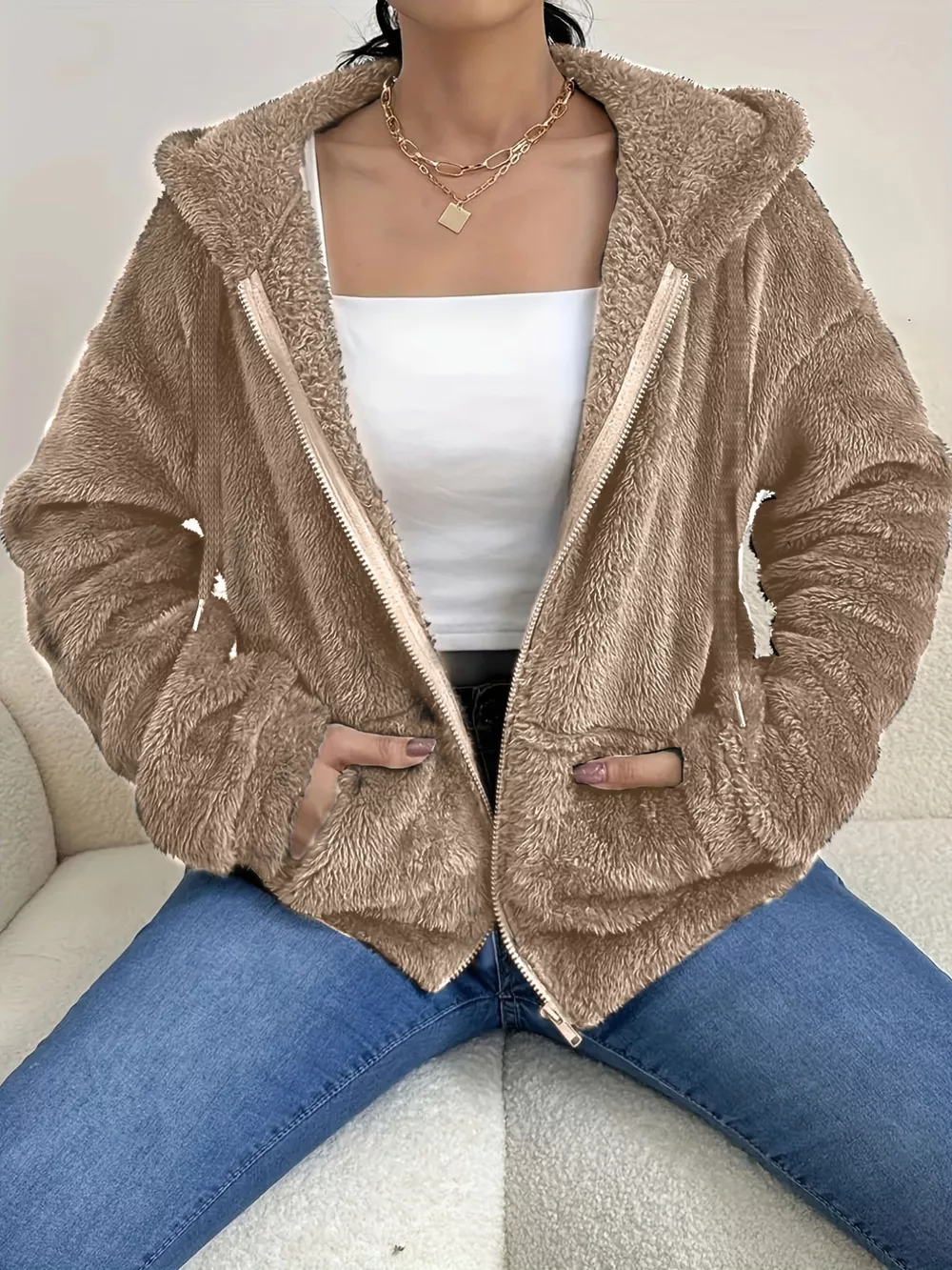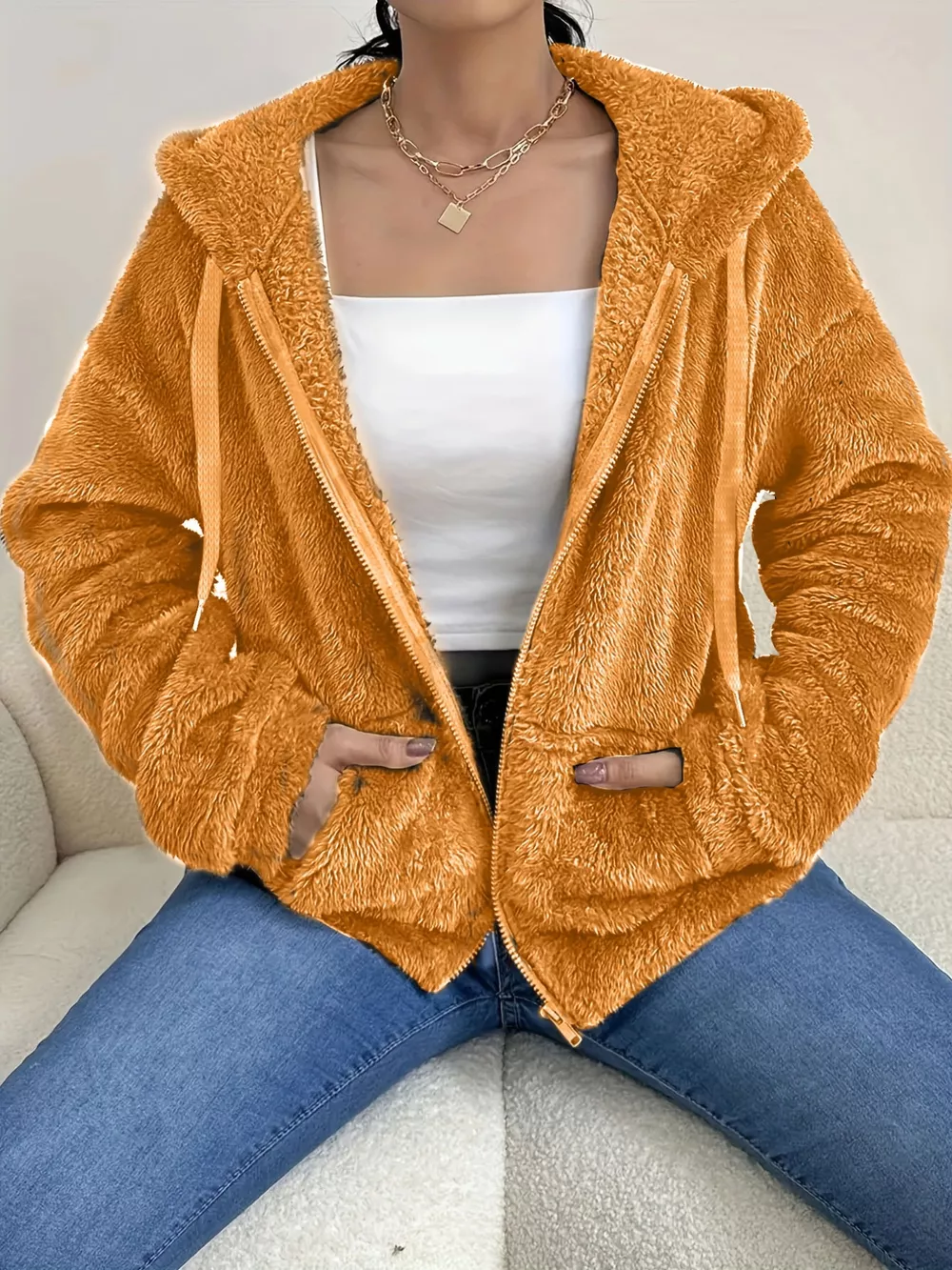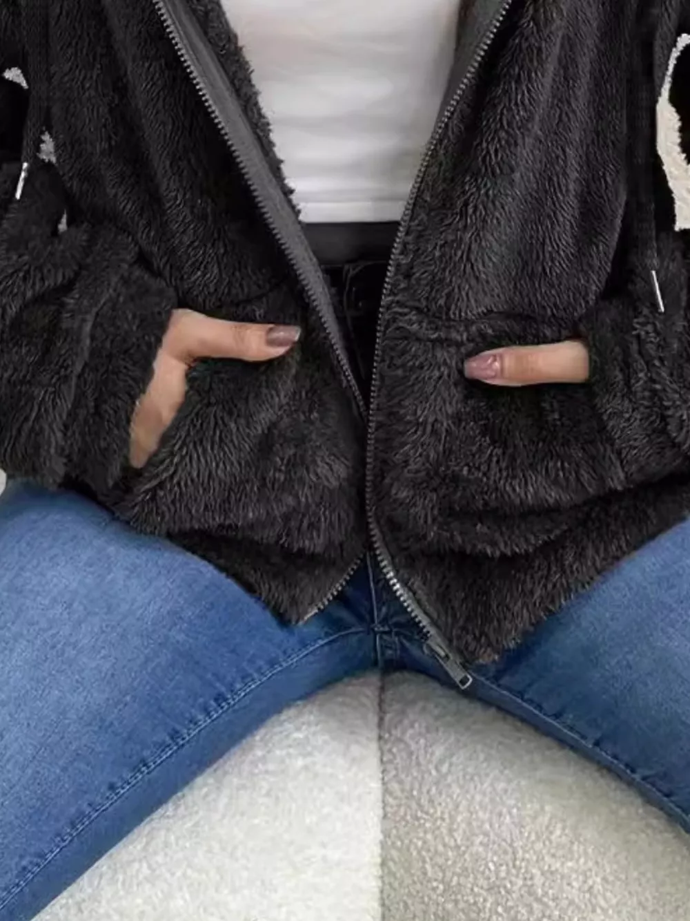 Drawstring Fleece Zip-Up Outerwear