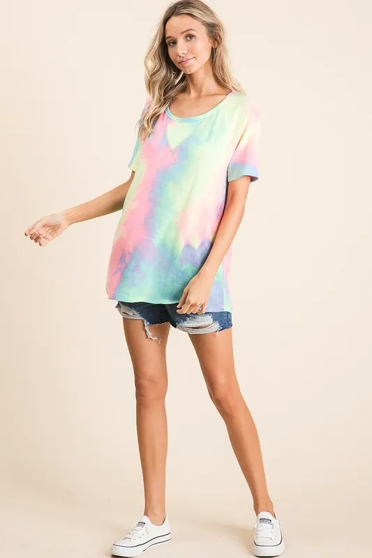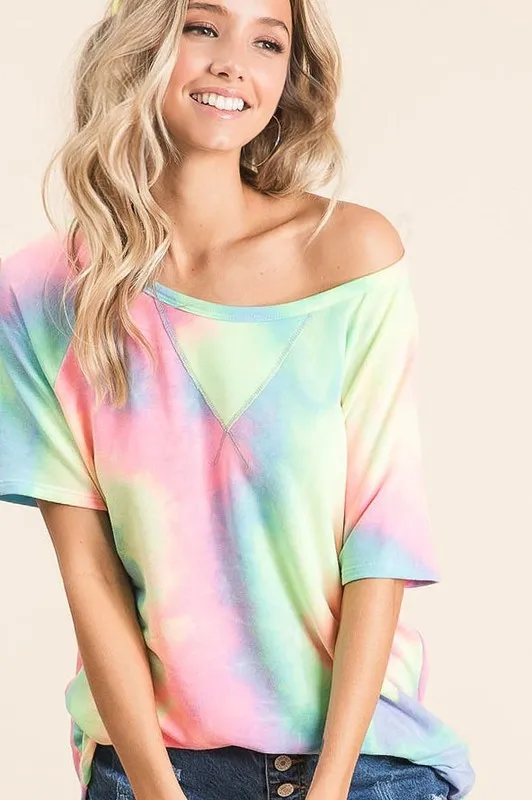 This Tie Dye French Terry Print Top is a fun and trendy addition to your wardrobe. The tie-dye print adds a playful and stylish touch to the classic French Terry fabric. With a comfortable fit and relaxed feel, this top is perfect for casual days or lounging at home. Pair it with your favorite jeans or leggings for a laid-back yet fashionable look. Elevate your style with this eye-catching and easy-to-wear top that exudes a cool and carefree vibe.