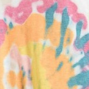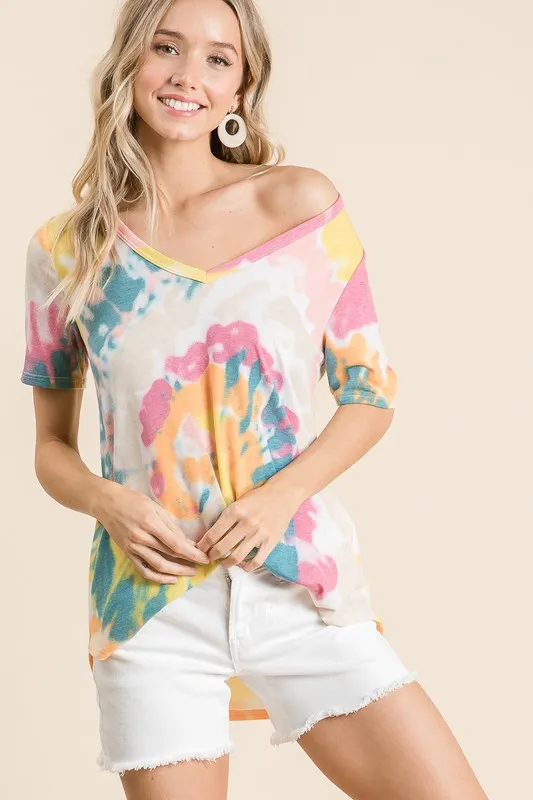 A circular tie-dye print V-neck top features a vibrant tie-dye pattern that forms circular designs on the fabric. This style of top typically has a V-shaped neckline, which is flattering and elongating, drawing attention to the decolletage. The circular tie-dye print adds a playful and trendy element to the top, making it a fun and eye-catching piece for casual wear. The combination of the tie-dye technique and V-neck design creates a stylish and fashionable look that is perfect for adding a pop of color and personality to your outfit. It can be styled with jeans, shorts, or skirts for a relaxed yet chic ensemble.