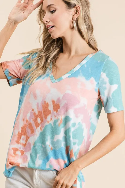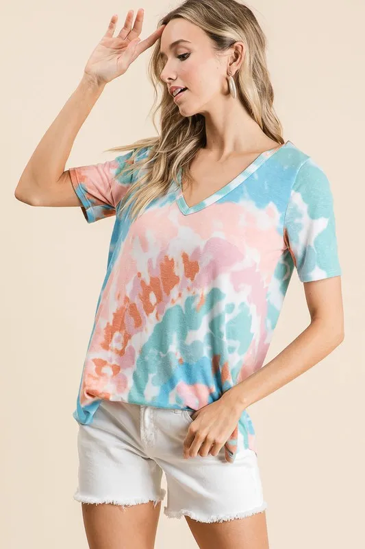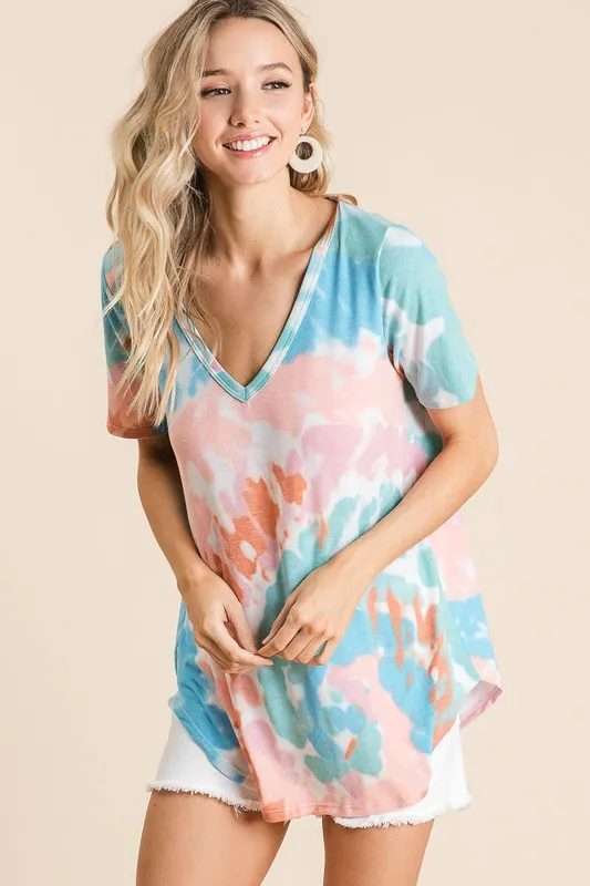 A circular tie-dye print V-neck top features a vibrant tie-dye pattern that forms circular designs on the fabric. This style of top typically has a V-shaped neckline, which is flattering and elongating, drawing attention to the decolletage. The circular tie-dye print adds a playful and trendy element to the top, making it a fun and eye-catching piece for casual wear. The combination of the tie-dye technique and V-neck design creates a stylish and fashionable look that is perfect for adding a pop of color and personality to your outfit. It can be styled with jeans, shorts, or skirts for a relaxed yet chic ensemble.