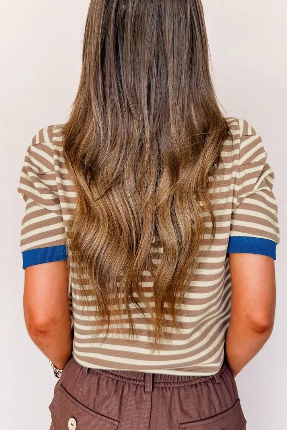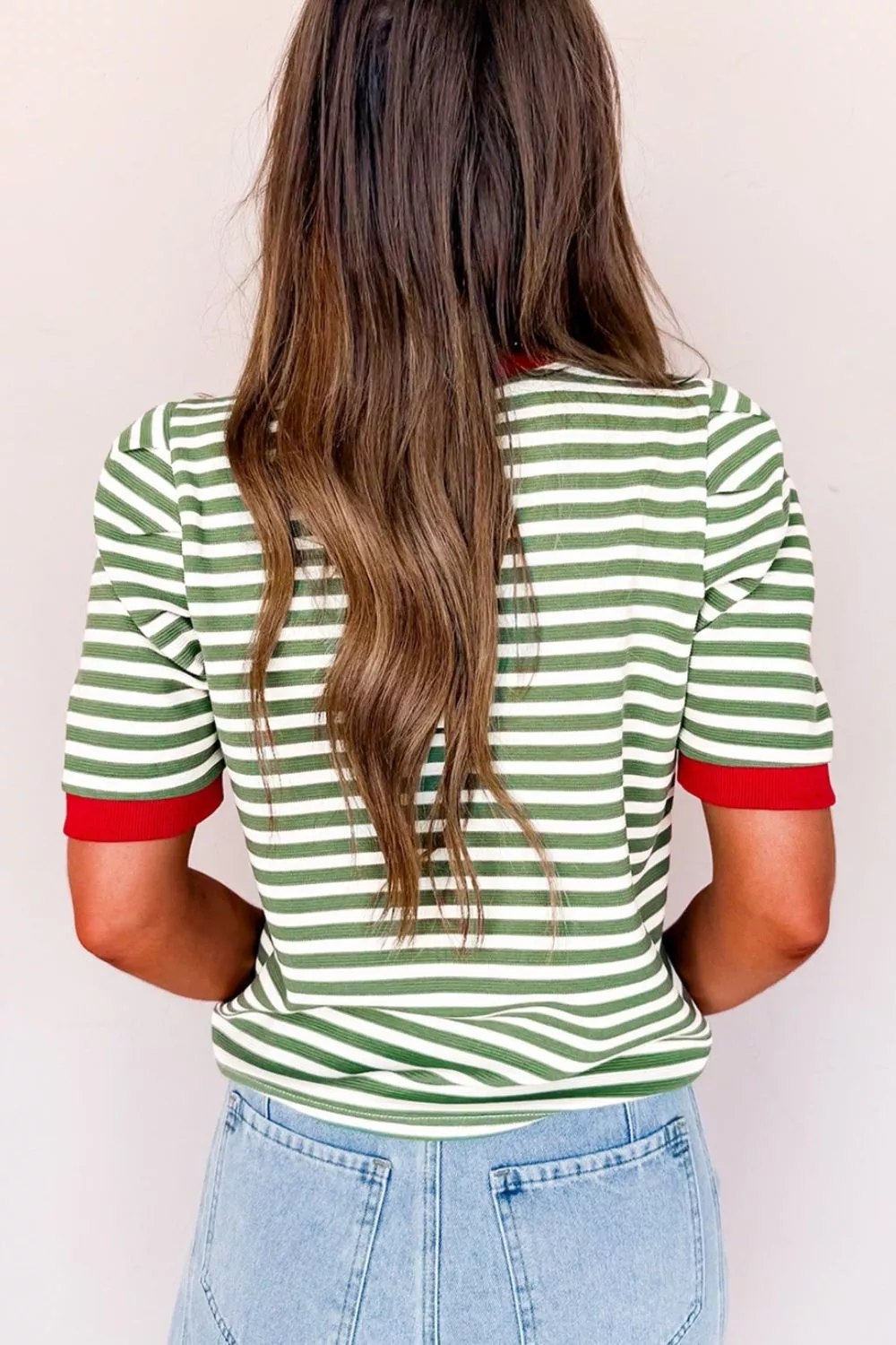 Stripe Short Puff Sleeve Contrast Trim Round Neck Tee