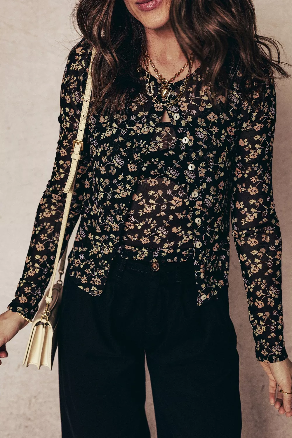 Floral Print Mesh Tank Button Front Slim Cardigan 2pcs Set