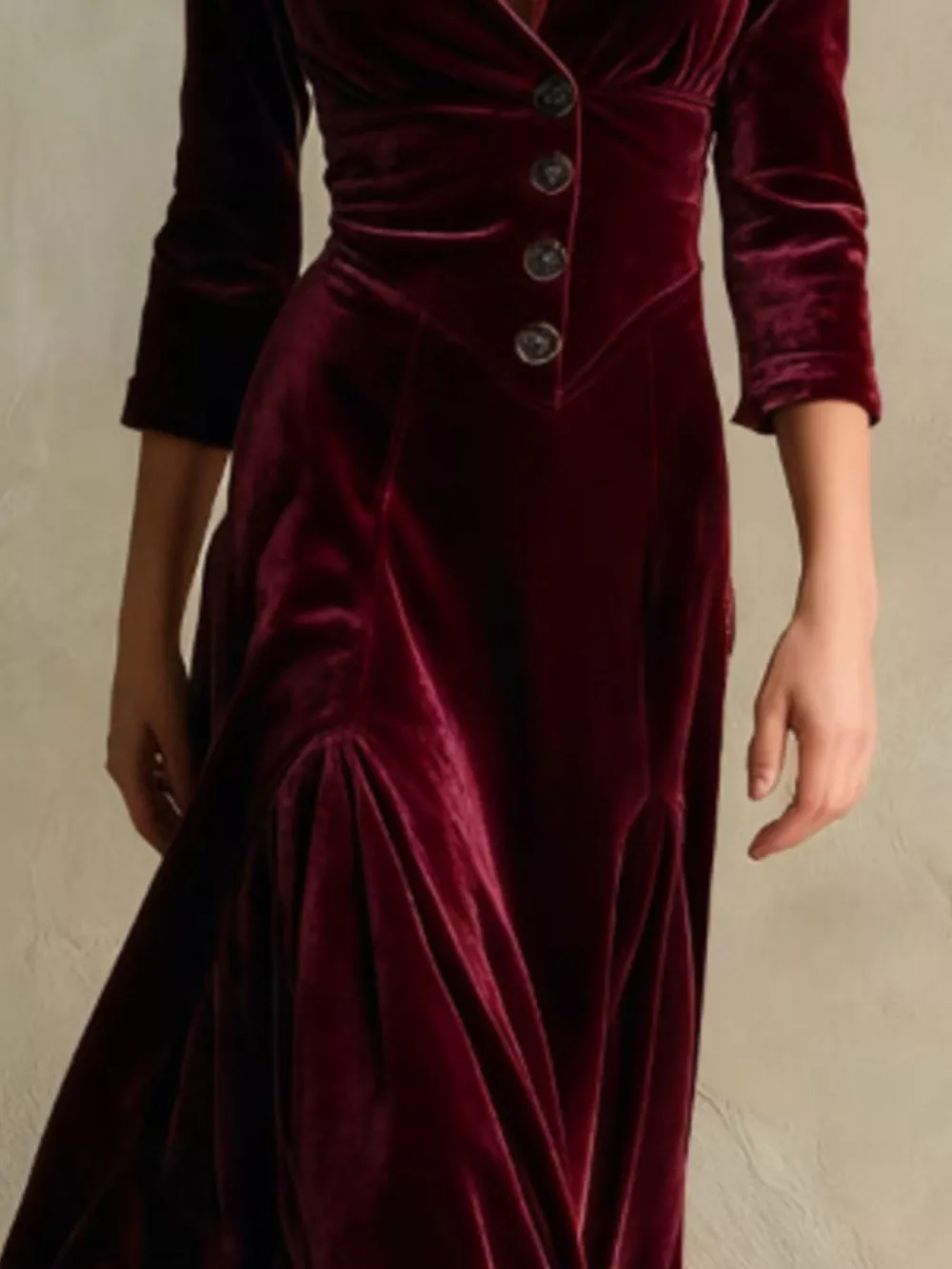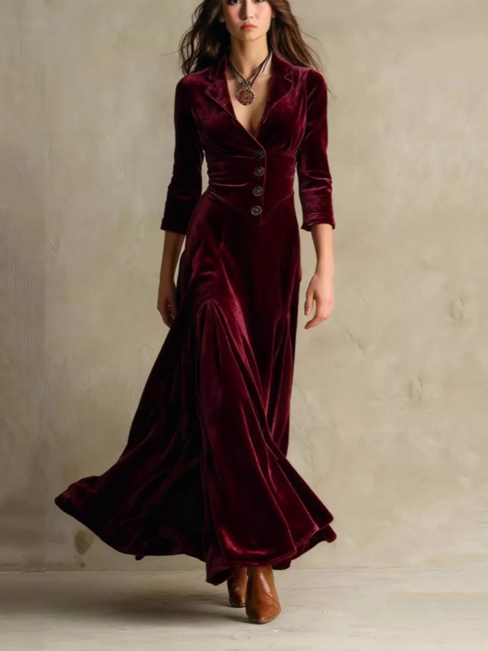 Velvet Button Front 3/4 Sleeve Maxi Dress