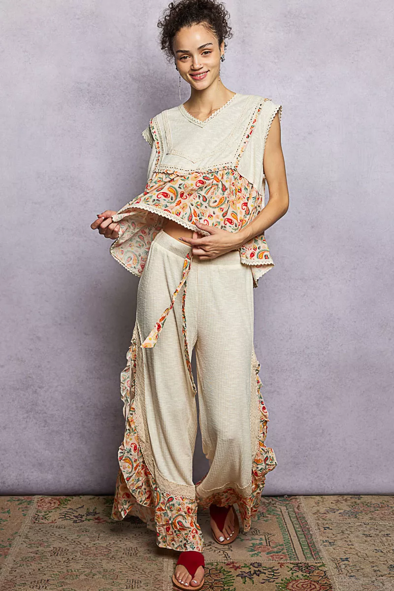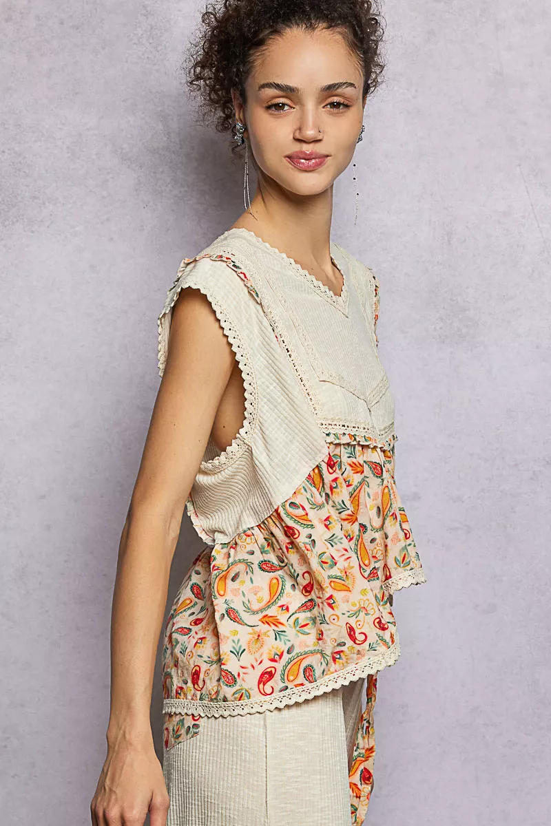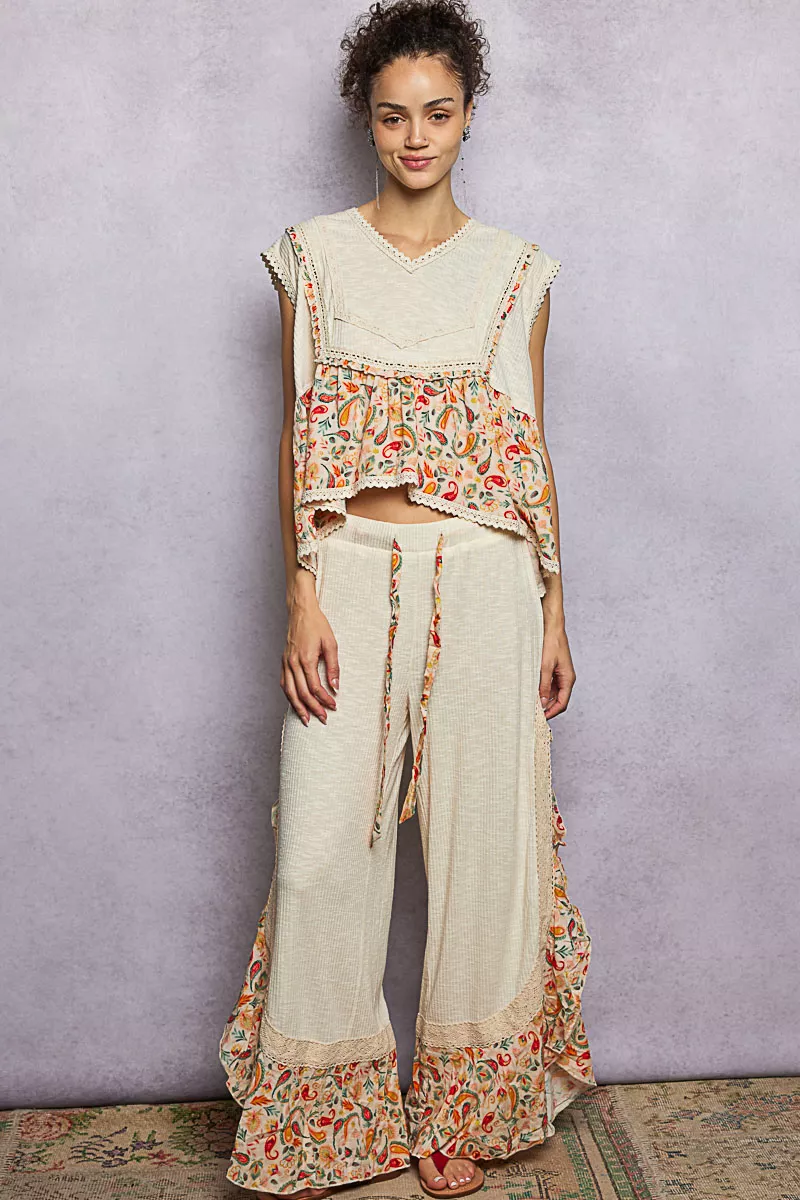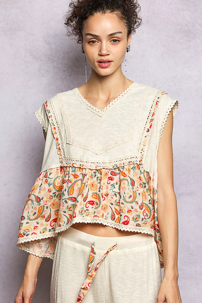 POL Lace Detail Floral Cropped Ruffled Top