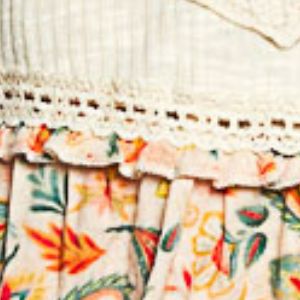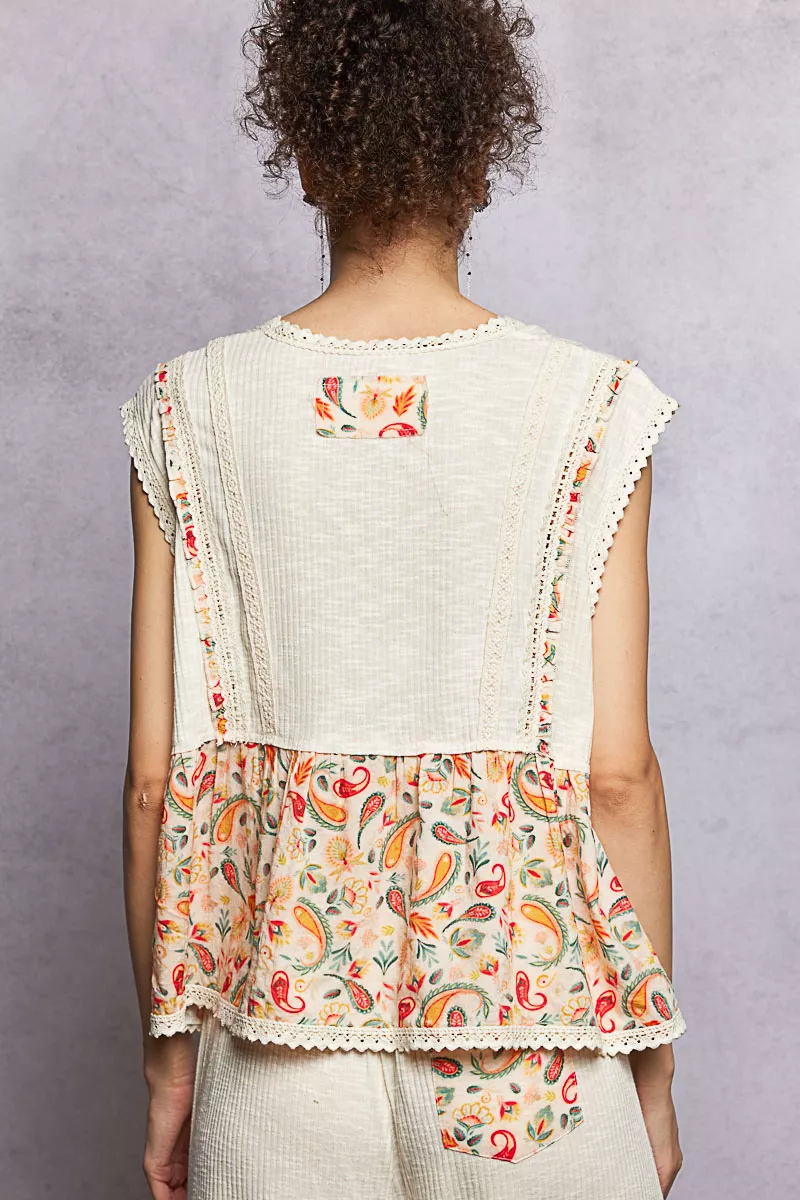 This sleeveless top is designed with a V-neck for a chic and flattering neckline. The relaxed fit provides comfort and ease of movement. Made from ribbed fabric, it offers texture and dimension to the look. The trim detail and ruffle accents add a touch of feminine charm. The pointed floral pattern adds a stylish and sophisticated element to this versatile piece.