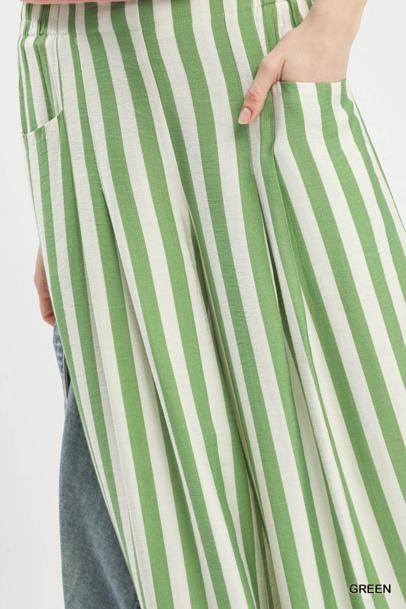 These Vertical Stripe Wide Leg Pants feature a trendy wide leg silhouette for a flowy and relaxed fit. The elastic waistband offers comfort and flexibility for all-day wear. Side pockets provide added functionality and convenience. The pleated detail adds a touch of sophistication to the design. Note that these pants are not lined, making them perfect for warmer weather and casual outings. Elevate your wardrobe with these stylish and versatile pants for a chic and effortless look.