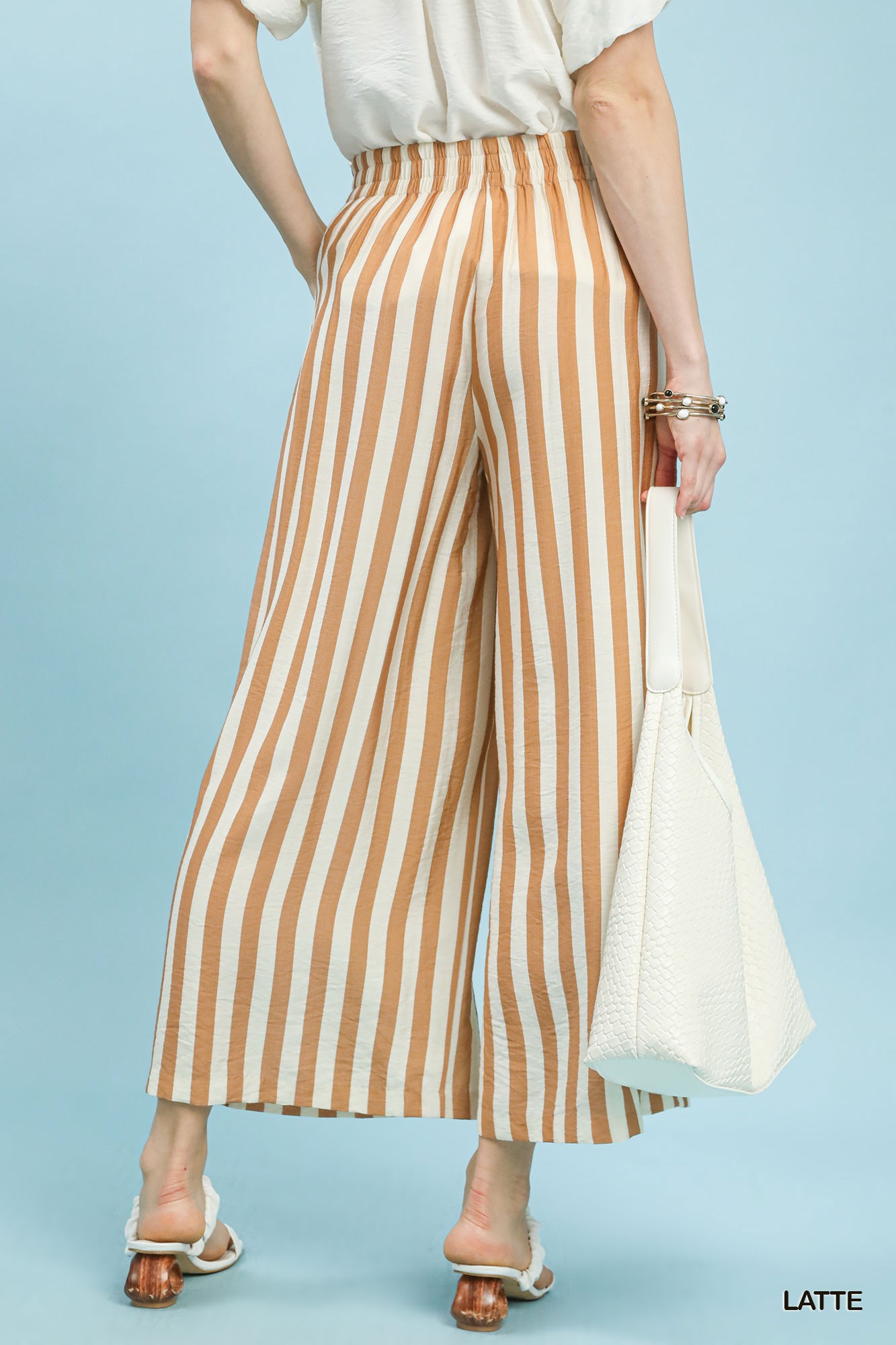 These Vertical Stripe Wide Leg Pants feature a trendy wide leg silhouette for a flowy and relaxed fit. The elastic waistband offers comfort and flexibility for all-day wear. Side pockets provide added functionality and convenience. The pleated detail adds a touch of sophistication to the design. Note that these pants are not lined, making them perfect for warmer weather and casual outings. Elevate your wardrobe with these stylish and versatile pants for a chic and effortless look.