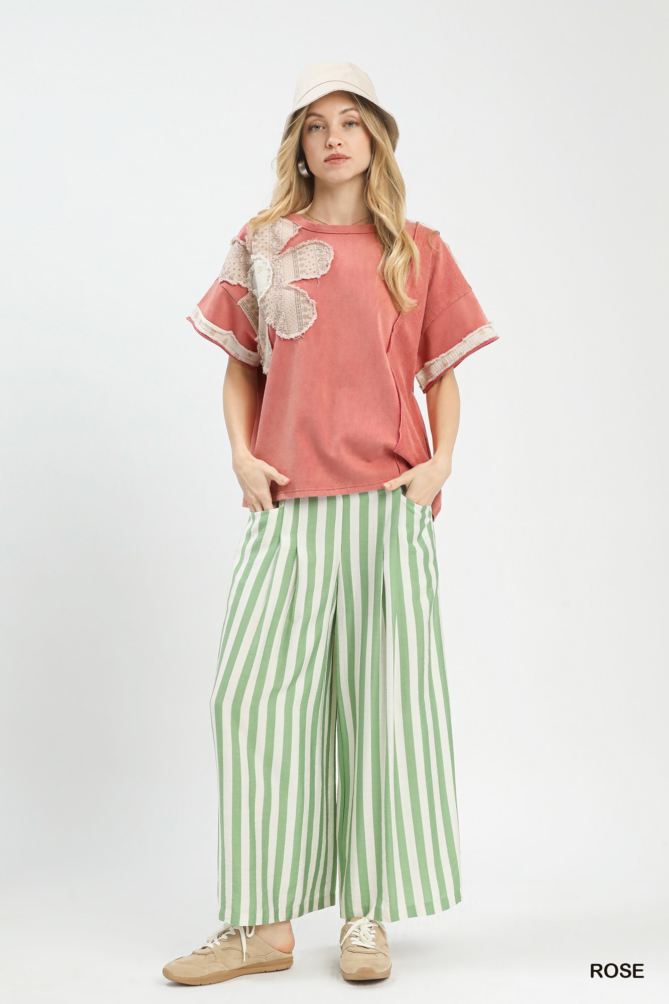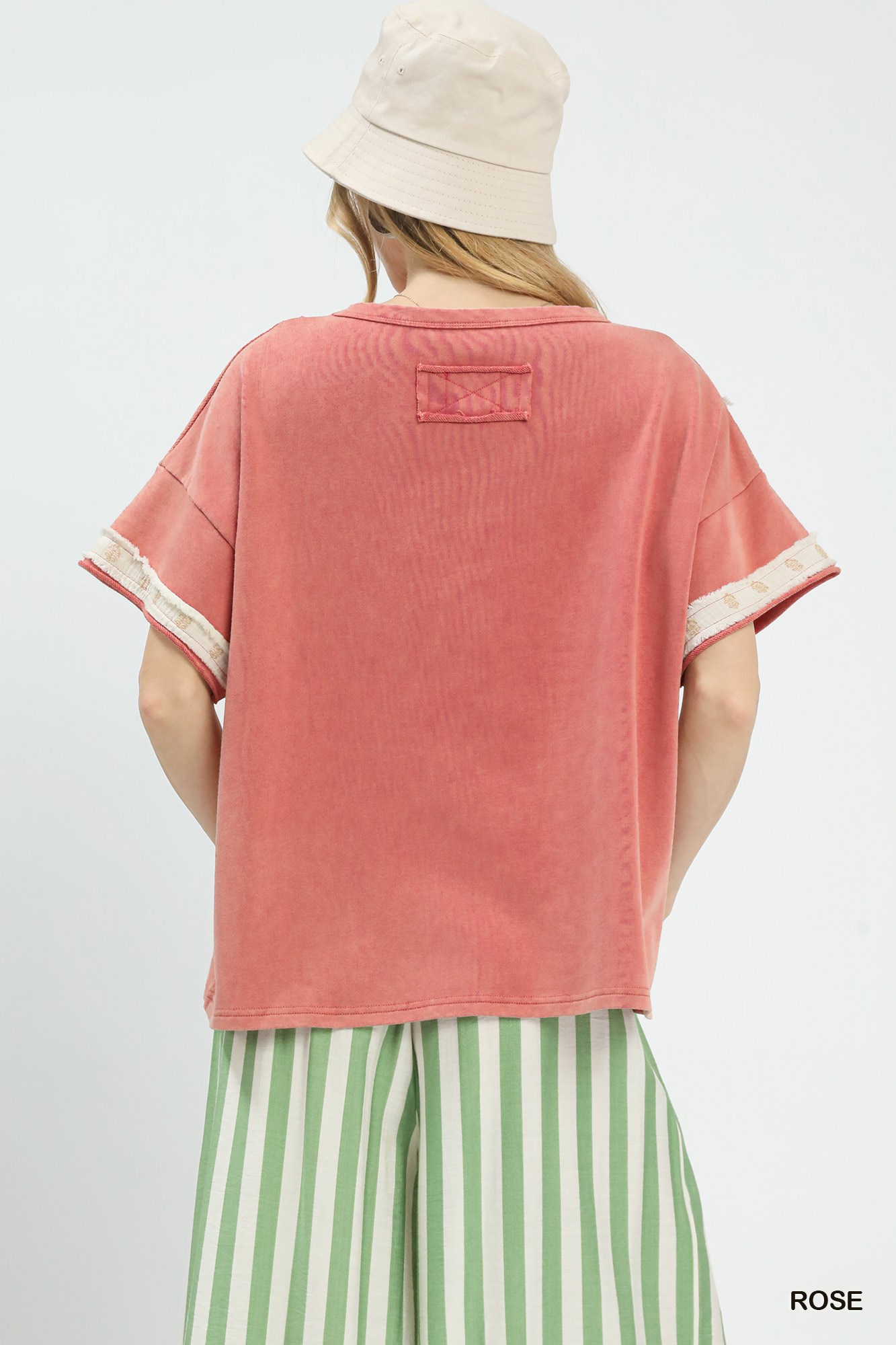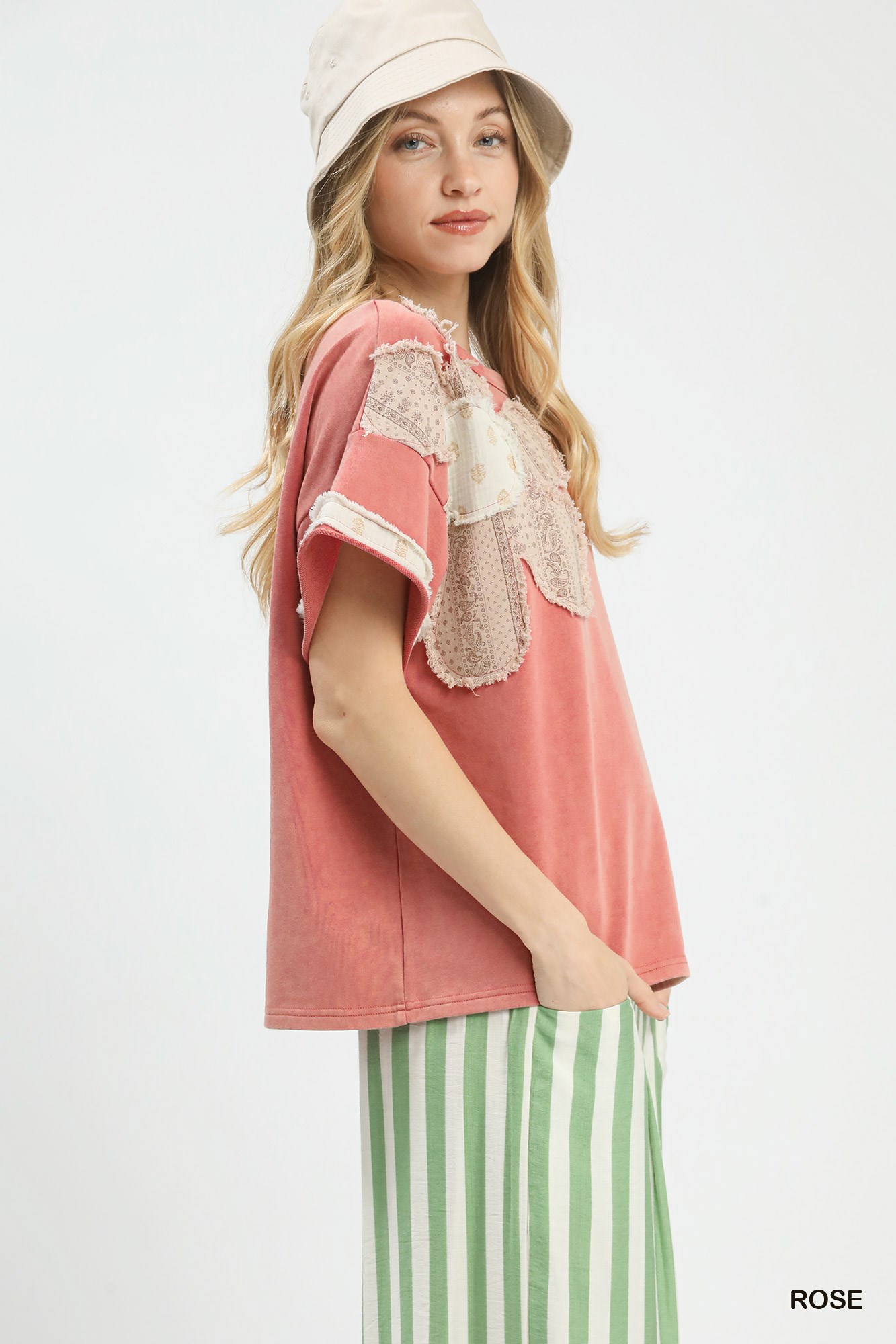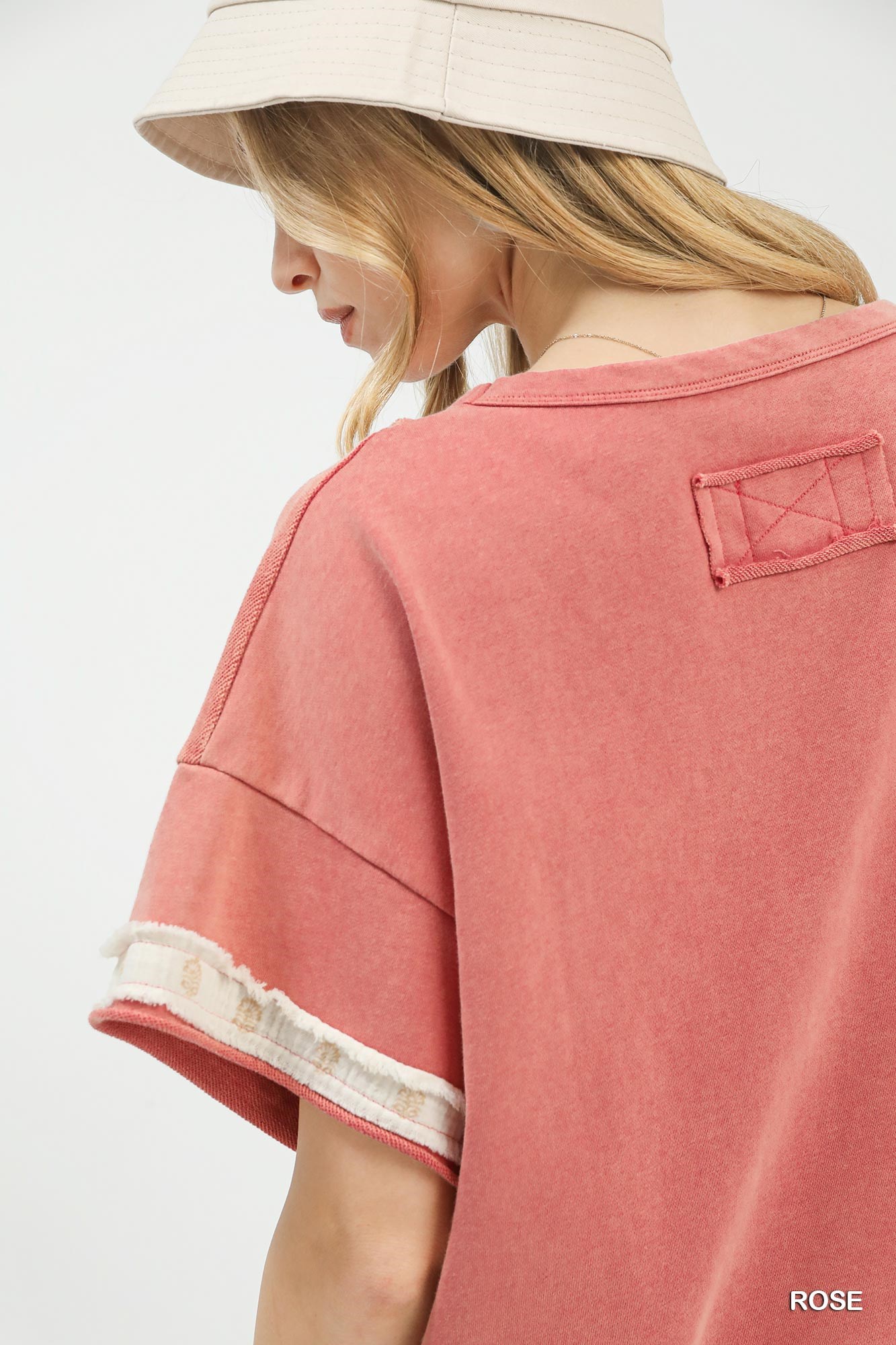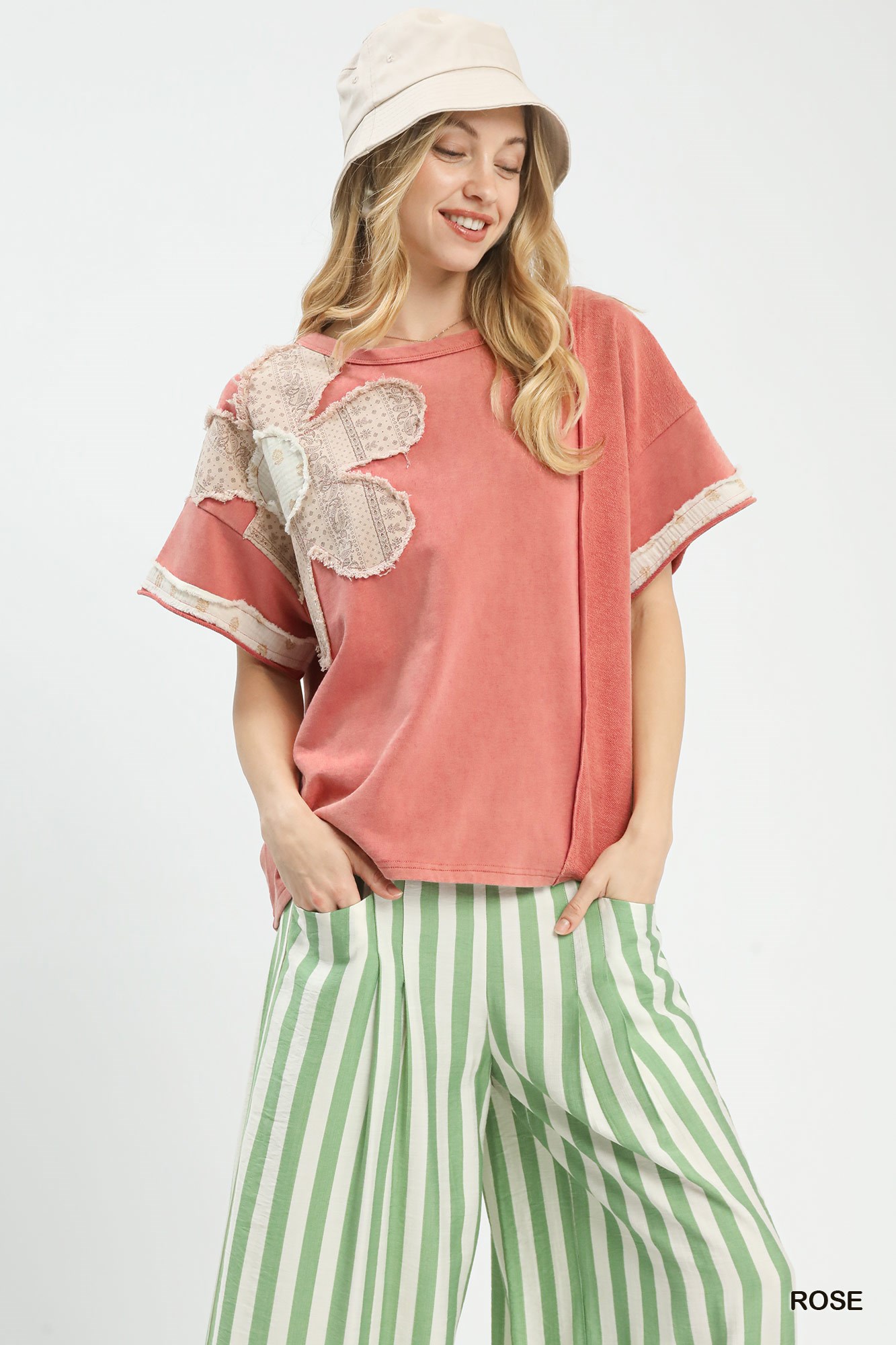 This French Terry Top is a laid-back essential with a touch of flair. Crafted from mineral wash French terry fabric, it offers a cozy and relaxed feel. The classic round neck design makes it versatile for various styling options. The short sleeves feature a contrast panel detail for a subtle pop of interest. Complete with a charming flower patch, this top adds a playful and feminine touch to your outfit. Note that this top is not lined, ideal for comfortable wear during warmer weather or layered looks.