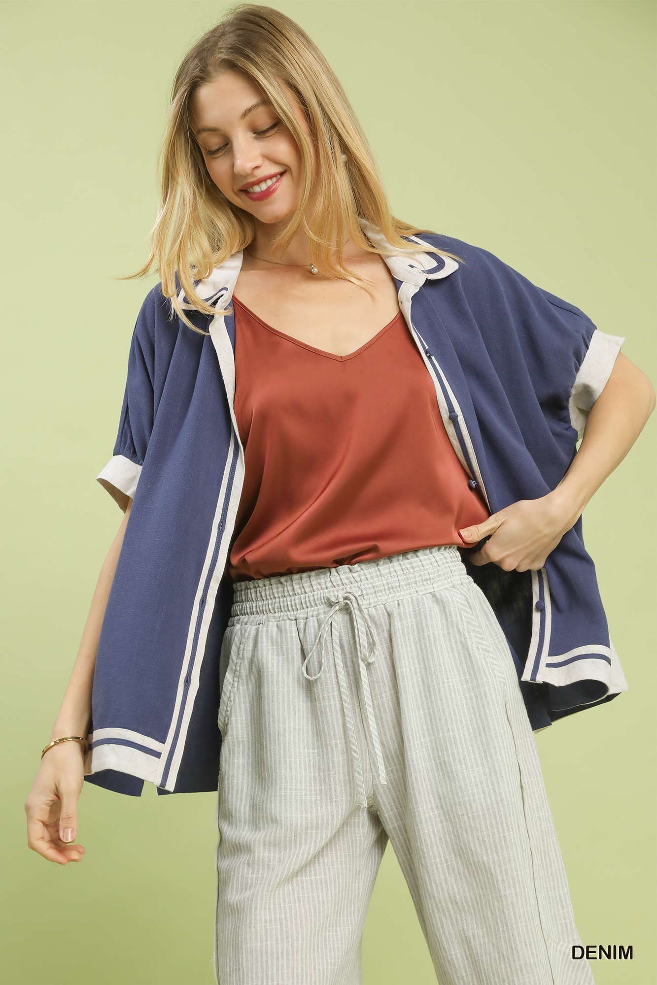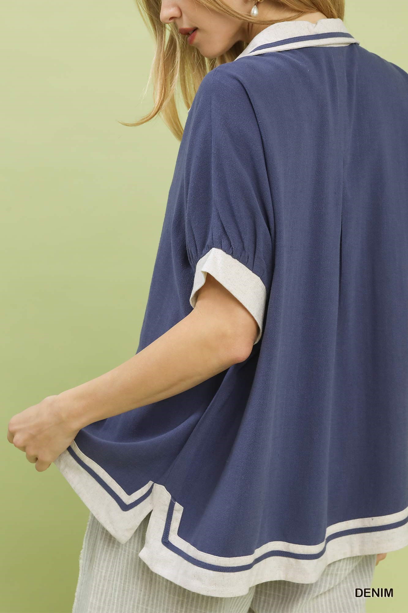 Umgee Linen Button Front Top with Contrast Piping