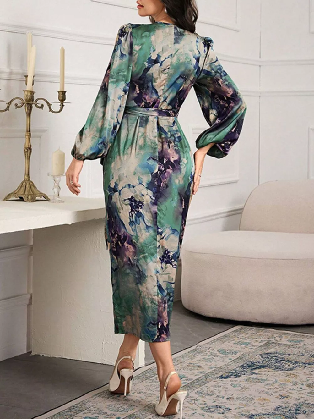 Printed Tie Waist Balloon Sleeve Dress