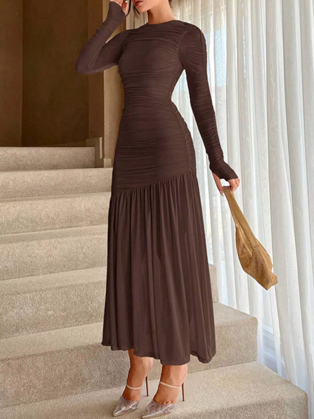 Ruched Long Sleeve Bodycon Midi Dress