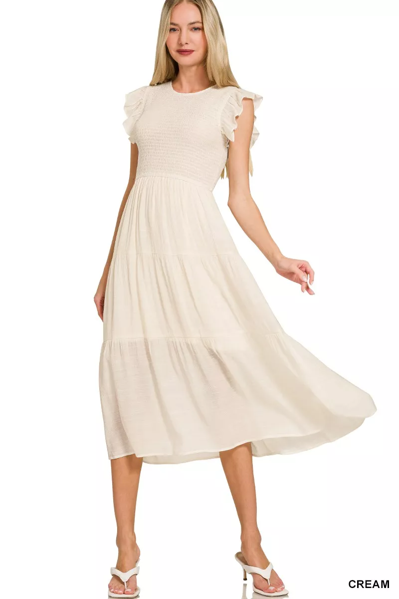 Zenana Woven Smocked Ruffle Sleeve Midi Dress