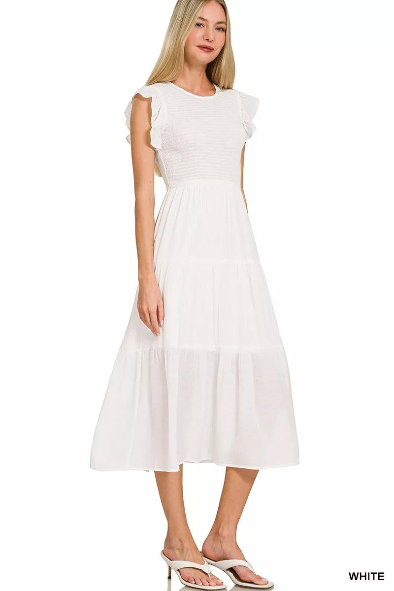 Zenana Woven Smocked Ruffle Sleeve Midi Dress
