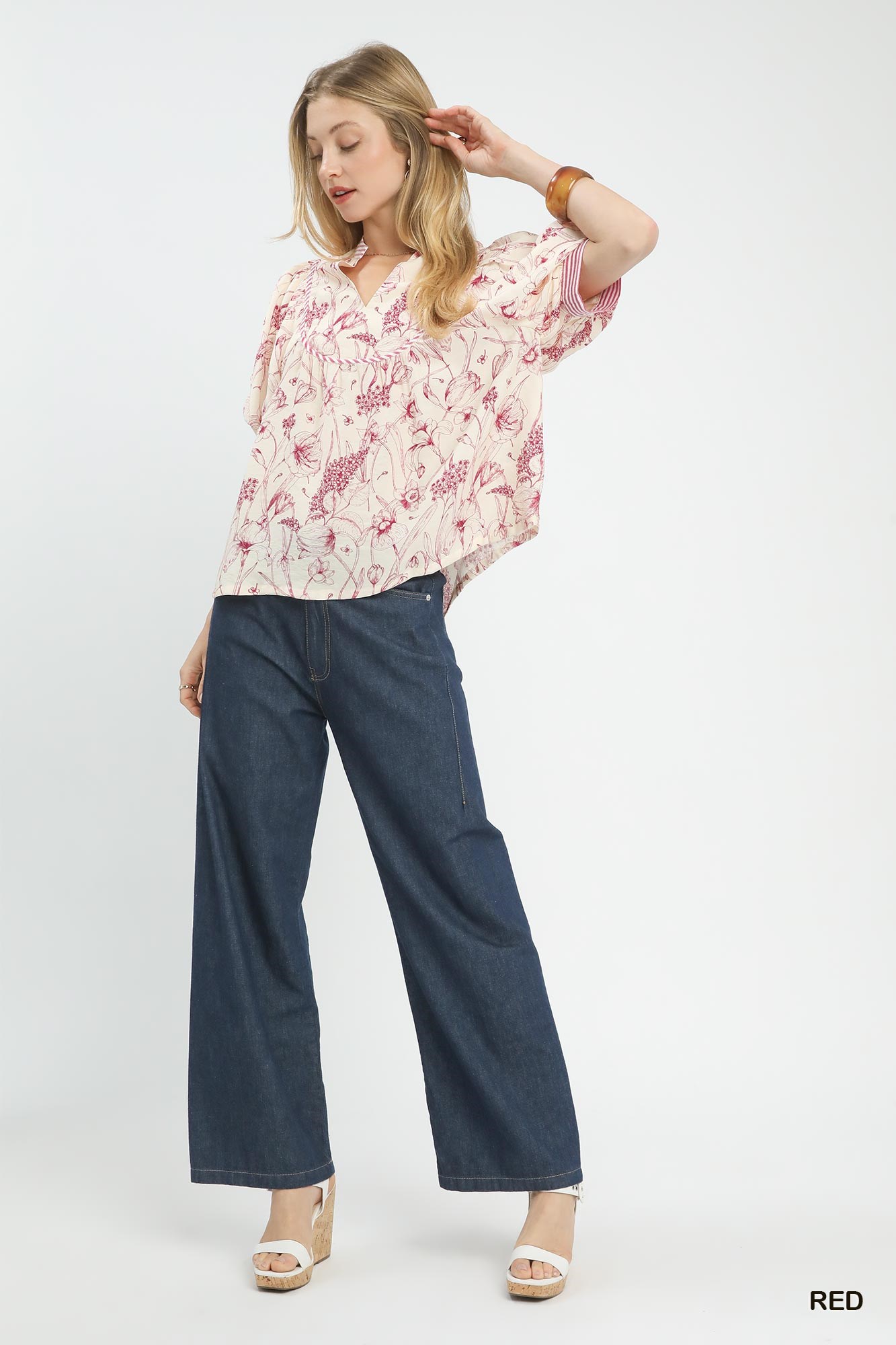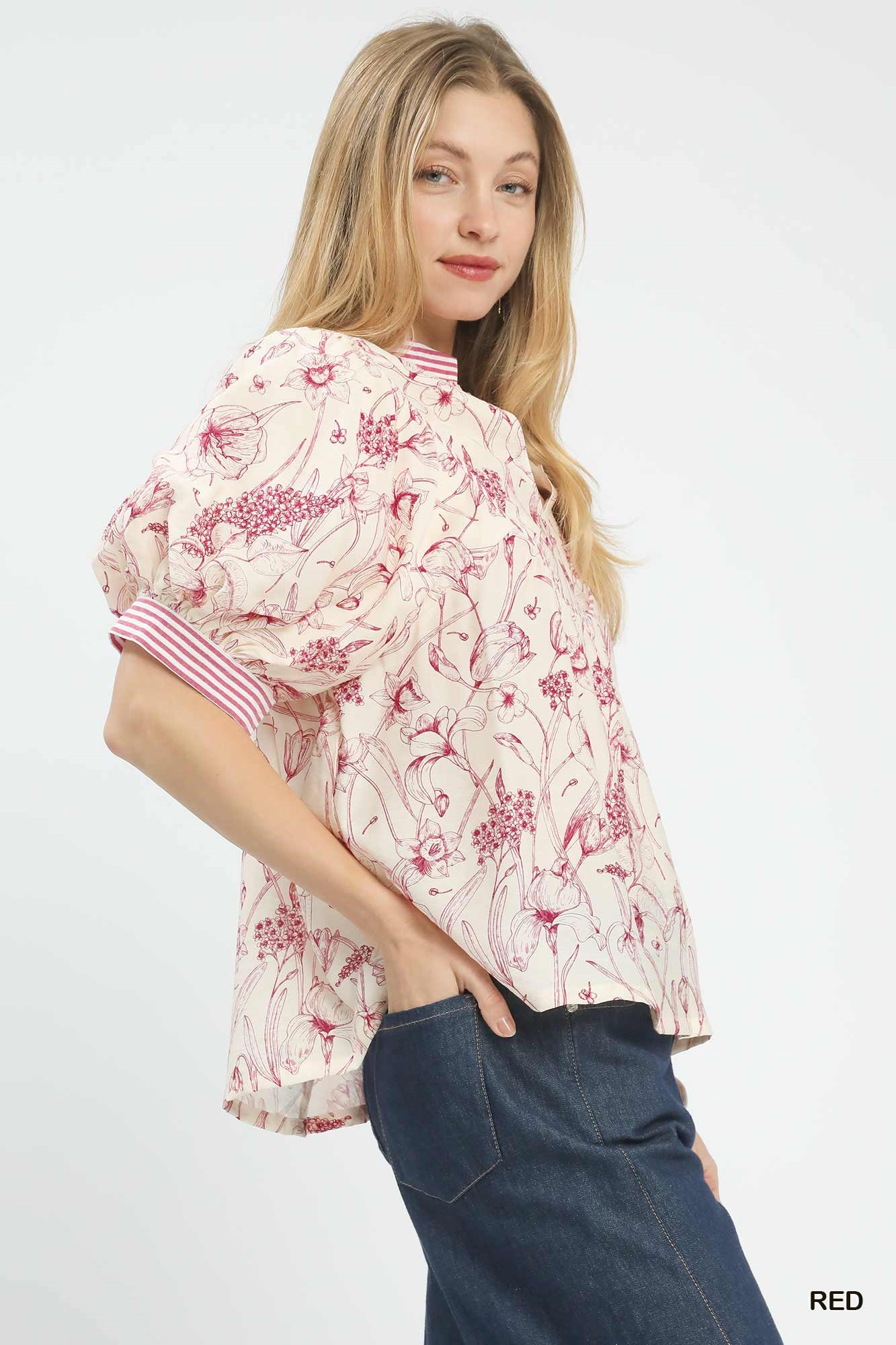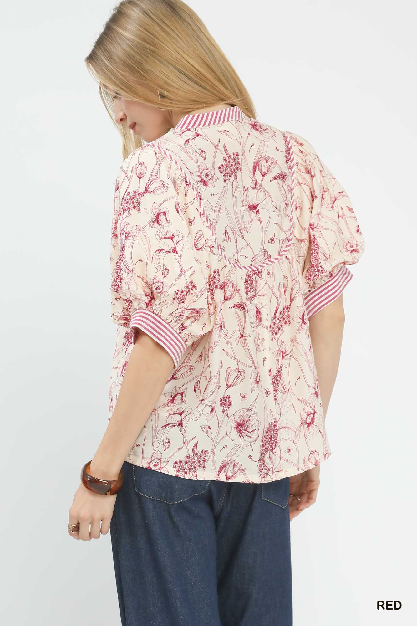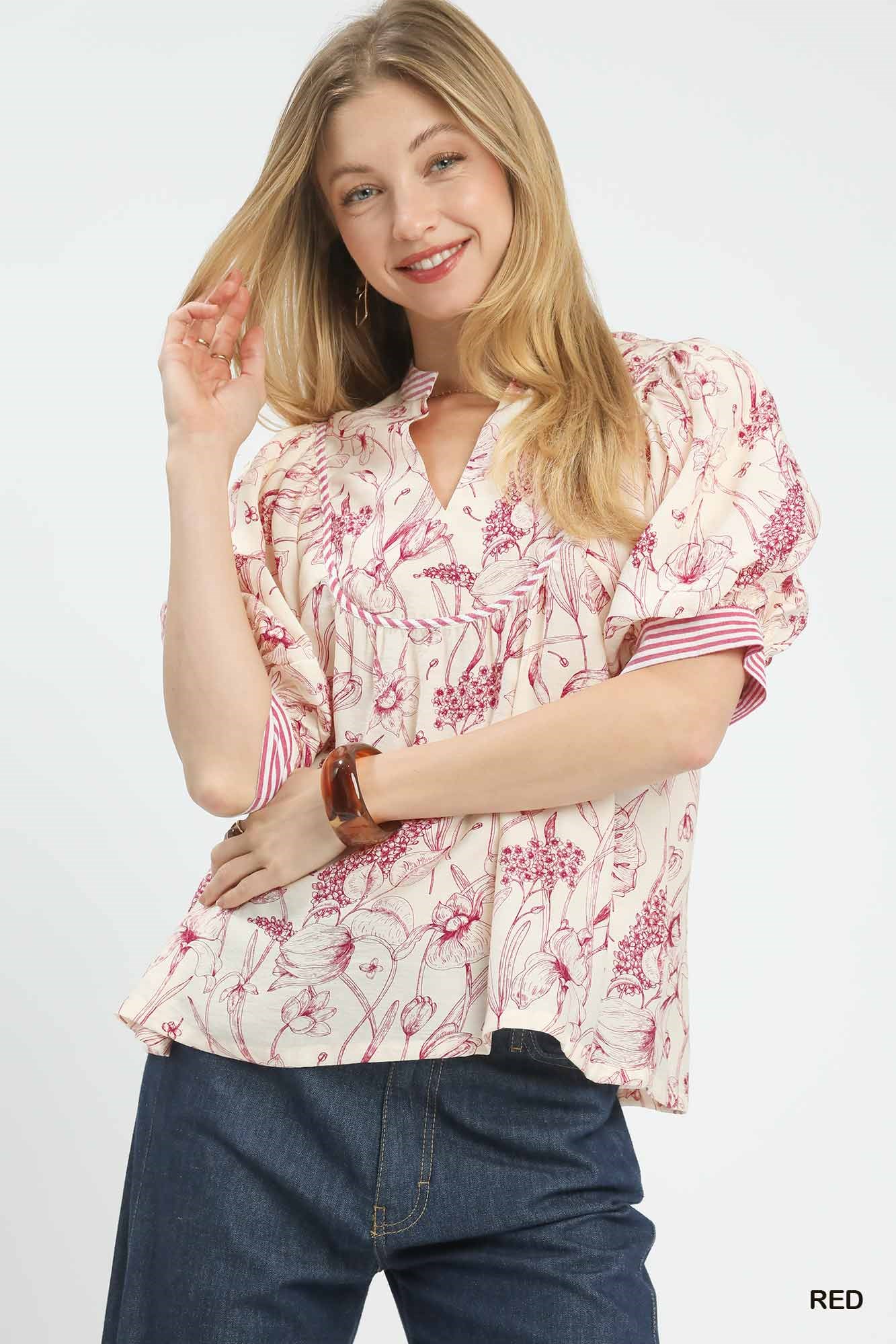 Umgee Mixed Print Puff Sleeve Split Neck Top