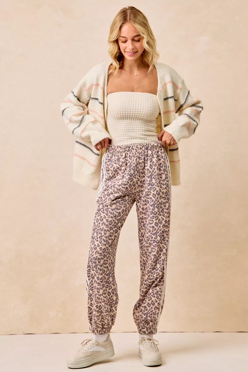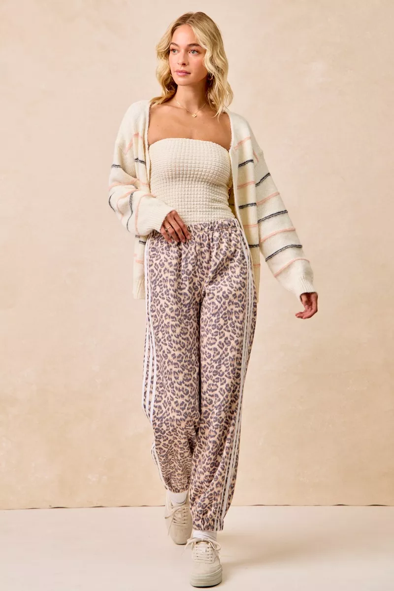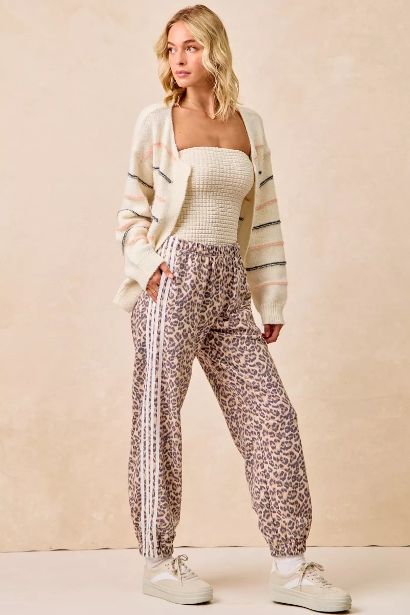 The Side Lines Leopard Track Pants are a stylish and trendy addition to your casual wardrobe. Featuring a leopard print design along the sides, these track pants add a bold and edgy touch to your look. The comfortable fabric and relaxed fit make them perfect for both lounging at home and running errands in style. Pair them with a simple t-shirt or a cropped hoodie for a chic and on-trend outfit. Stand out with confidence in the Side Lines Leopard Track Pants.
