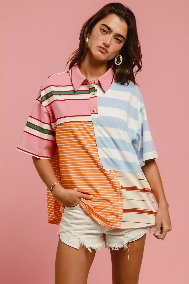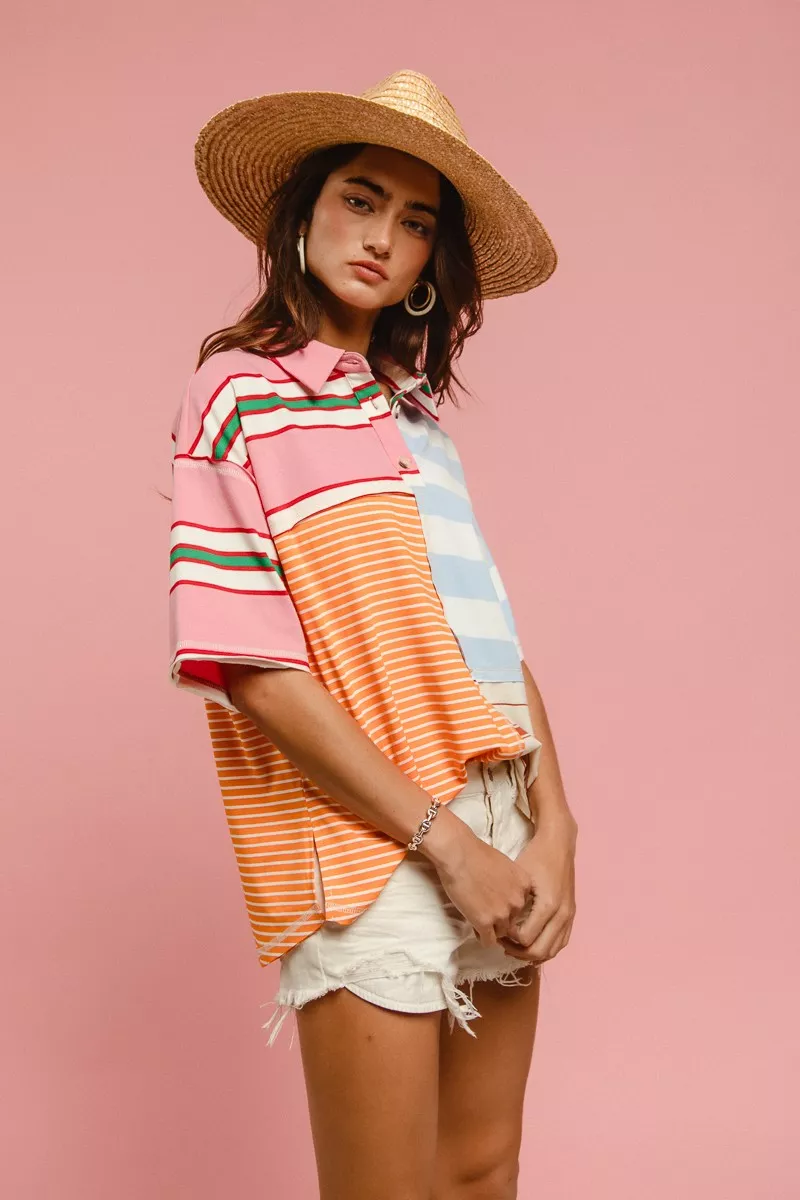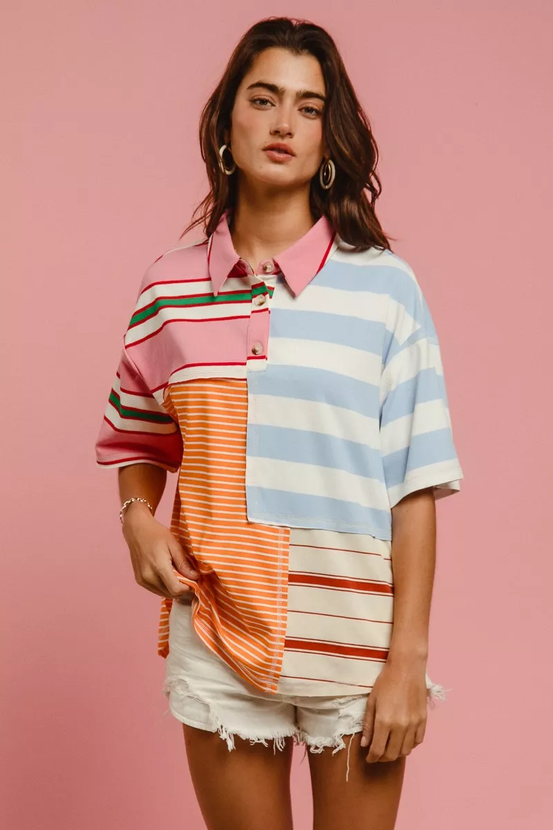 The Mix and Match Stripe Color Block Shirt is a trendy and versatile piece that allows you to play with different patterns and colors. With its unique mix of stripes and color blocks, this shirt adds a fun and dynamic element to your outfit. The combination of various patterns creates a visually interesting look that is sure to make a statement. Whether styled with jeans for a casual day out or paired with trousers for a more polished ensemble, this shirt offers countless outfit options. Elevate your wardrobe with the fashion-forward and stylish Mix and Match Stripe Color Block Shirt today!