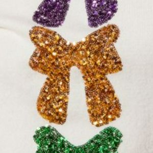 A Mardi Gras sequins bow ribbon embellished sweater is a festive and eye-catching piece featuring sequins, bows, and ribbon details inspired by the vibrant colors and celebrations of Mardi Gras. It is perfect for adding some fun and flair to your outfit during the festive season or themed events.