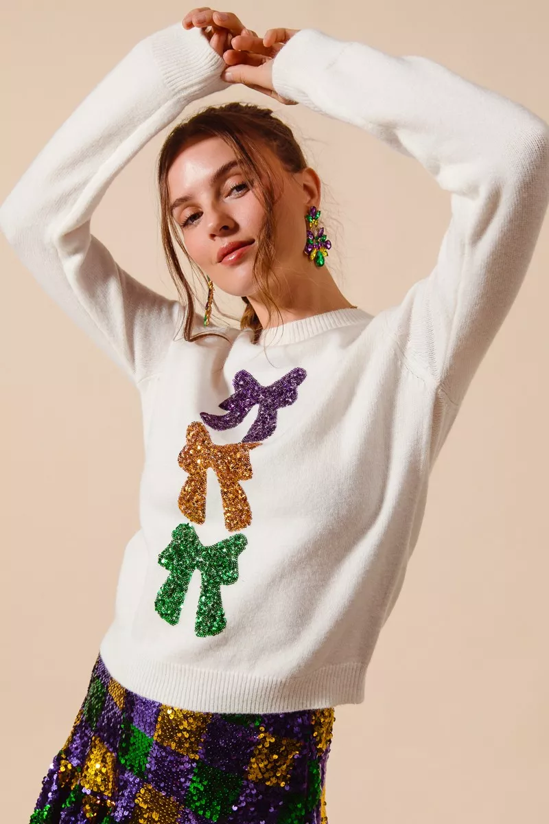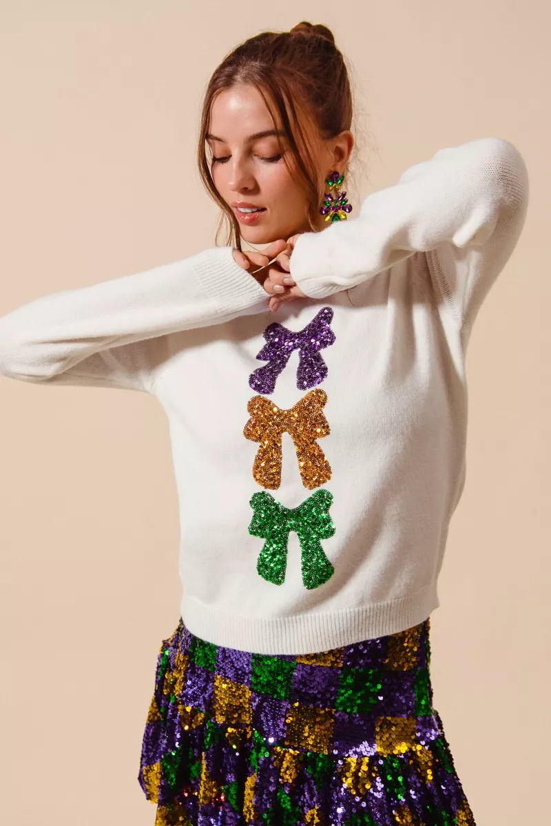 SO ME Mardi Gras Sequins Bow Ribbon Embellished Sweater