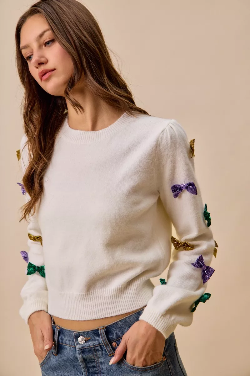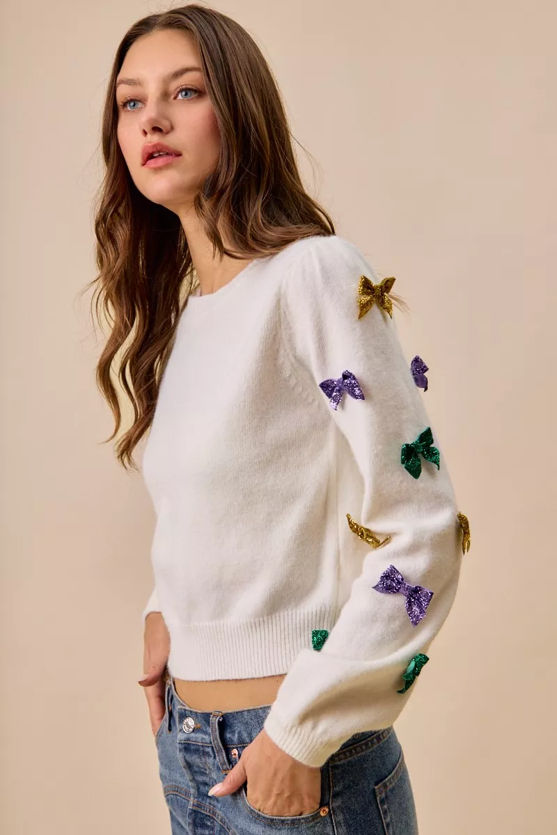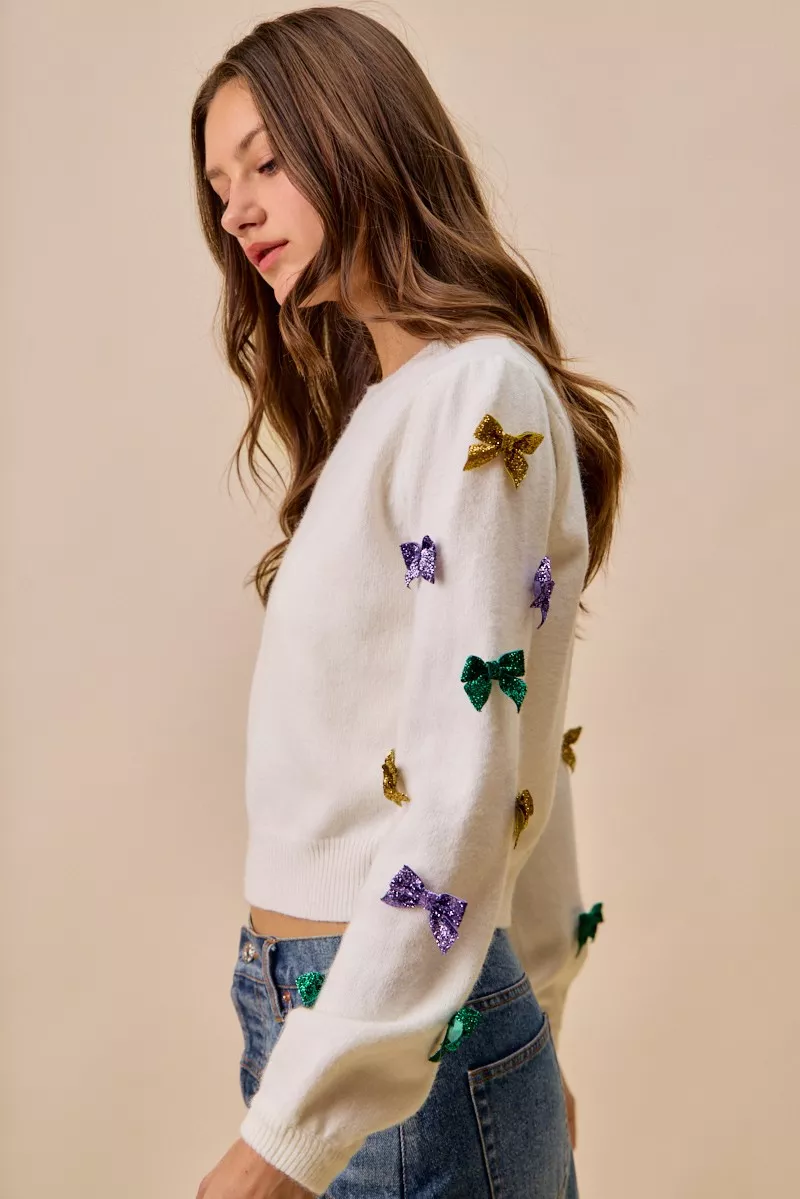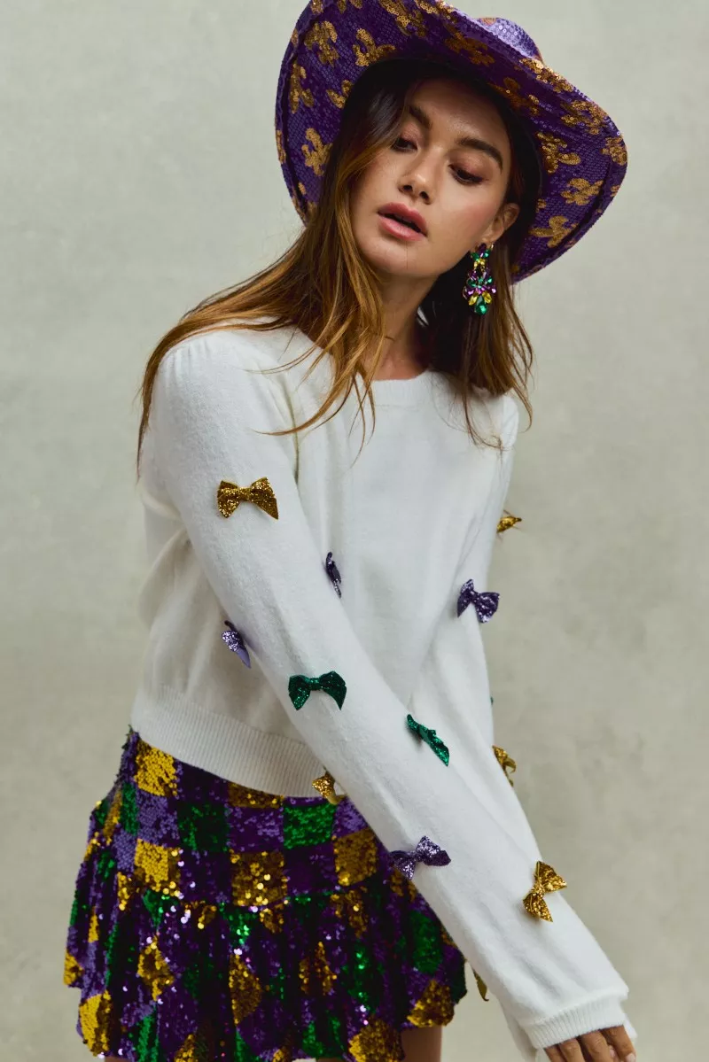 SO ME Mardi Gras Glitter Bow Ribbon Sweater Knit Top