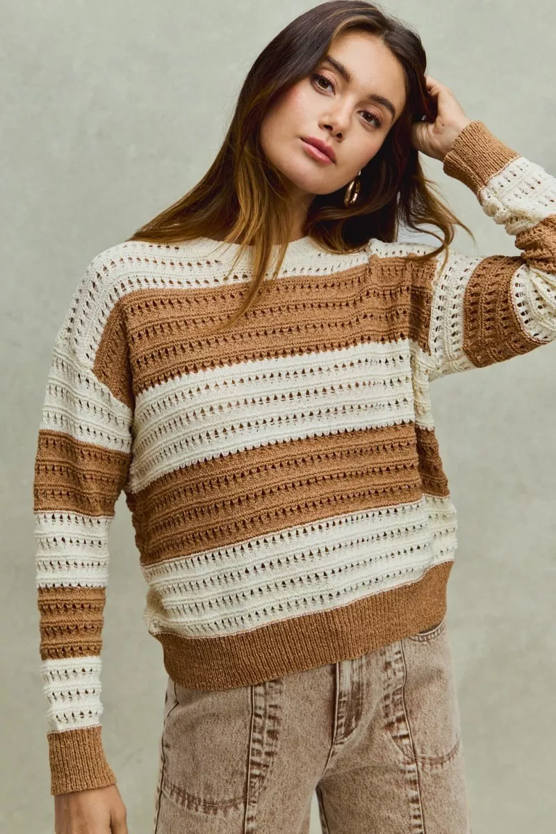 SO ME Openwork Round Neck Wide Stripe Textured Sweater