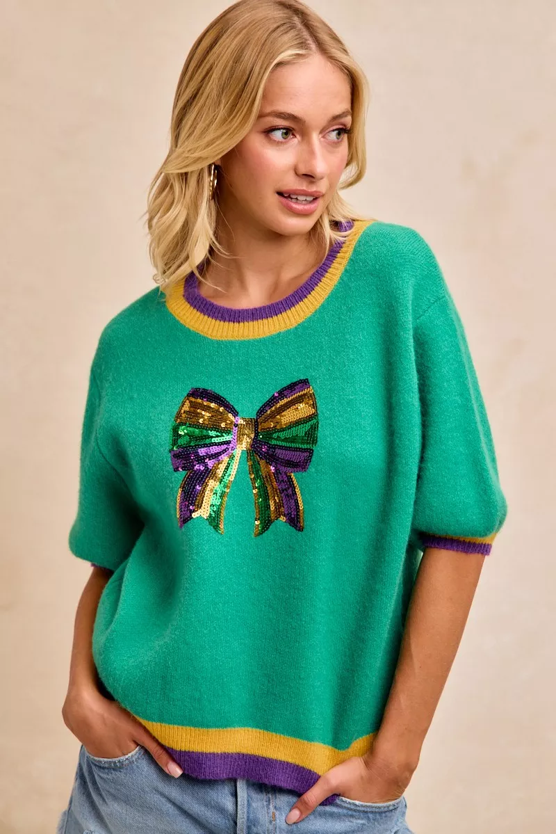 The Mardi Gras Sequin Ribbon Patched Sweater Top is a festive and eye-catching addition to your wardrobe. This sweater top features vibrant sequin details and colorful ribbon patches, perfect for celebrating special occasions. The comfortable sweater material ensures both warmth and style. Pair it with your favorite jeans or skirt for a fun and playful look. Stand out in style with the Mardi Gras Sequin Ribbon Patched Sweater Top.