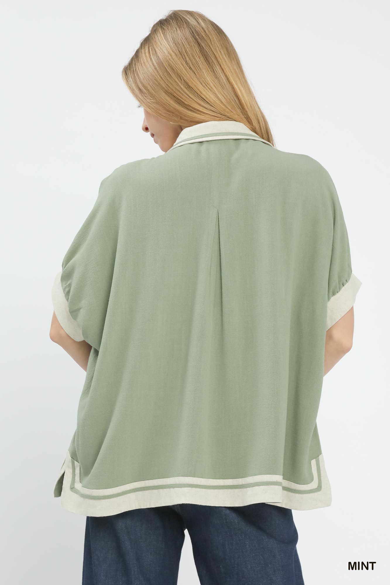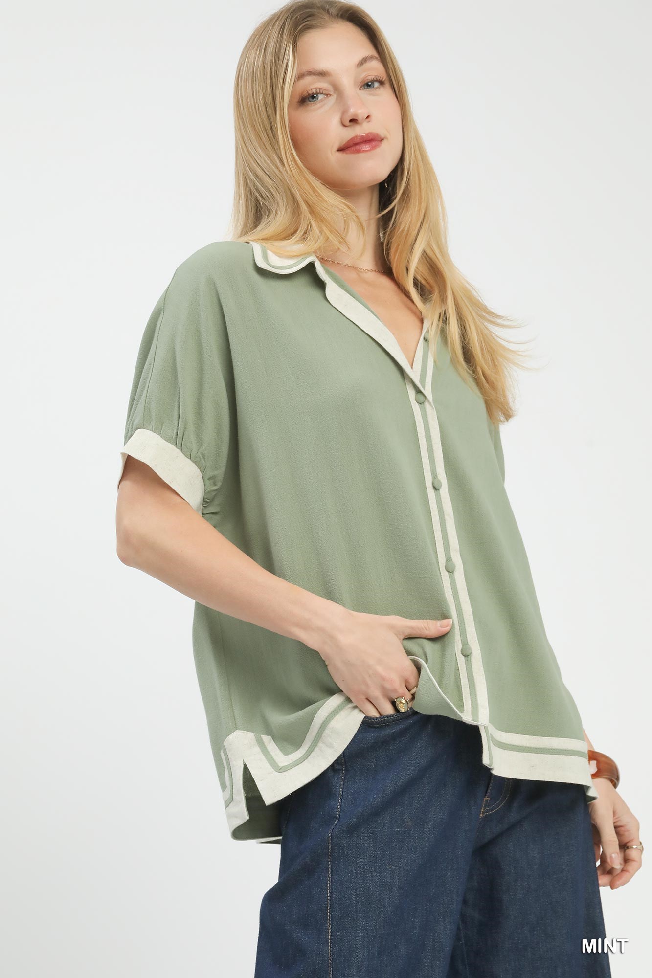 This Linen Button Front Top exudes a timeless style with its collared neckline and contrast piping detailing. The short sleeves add a casual touch to the design, perfect for warm weather. Featuring a full button-down closure, this versatile top can be easily styled for various occasions. Made of linen, it offers a lightweight and breathable feel for all-day comfort. Please note that this top is not lined, ideal for wearing in hot climates.