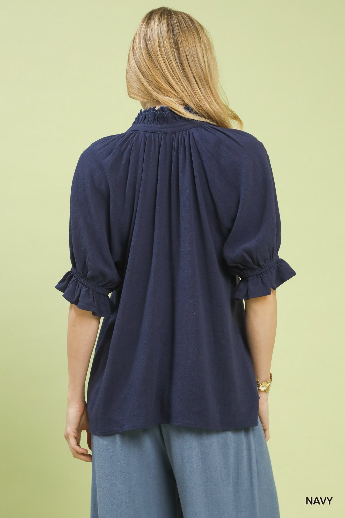 Umgee Linen Scalloped Ruffle Neck Blouse