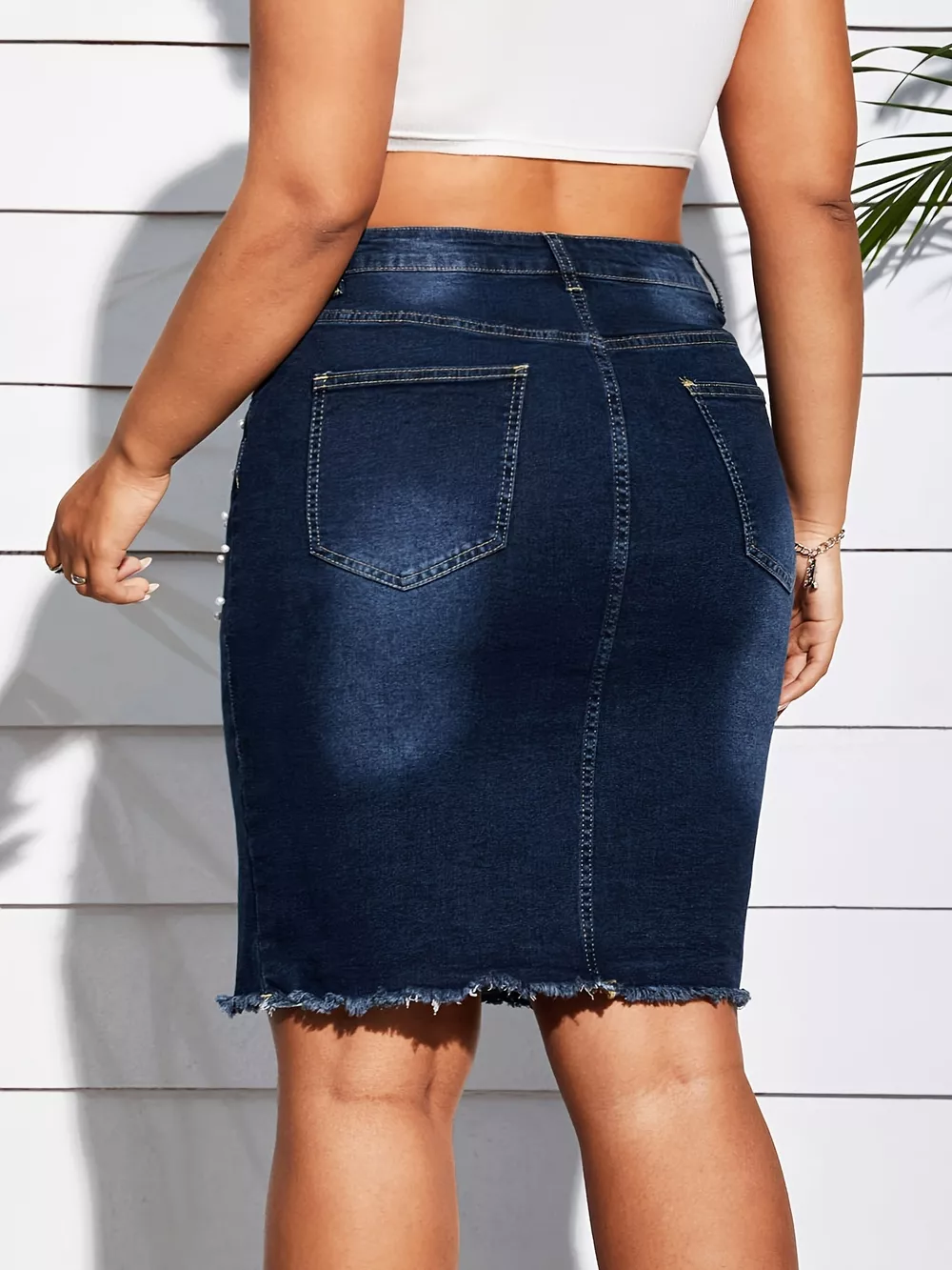 Plus Size Pearl Embellished Frayed Hem Denim Skirt