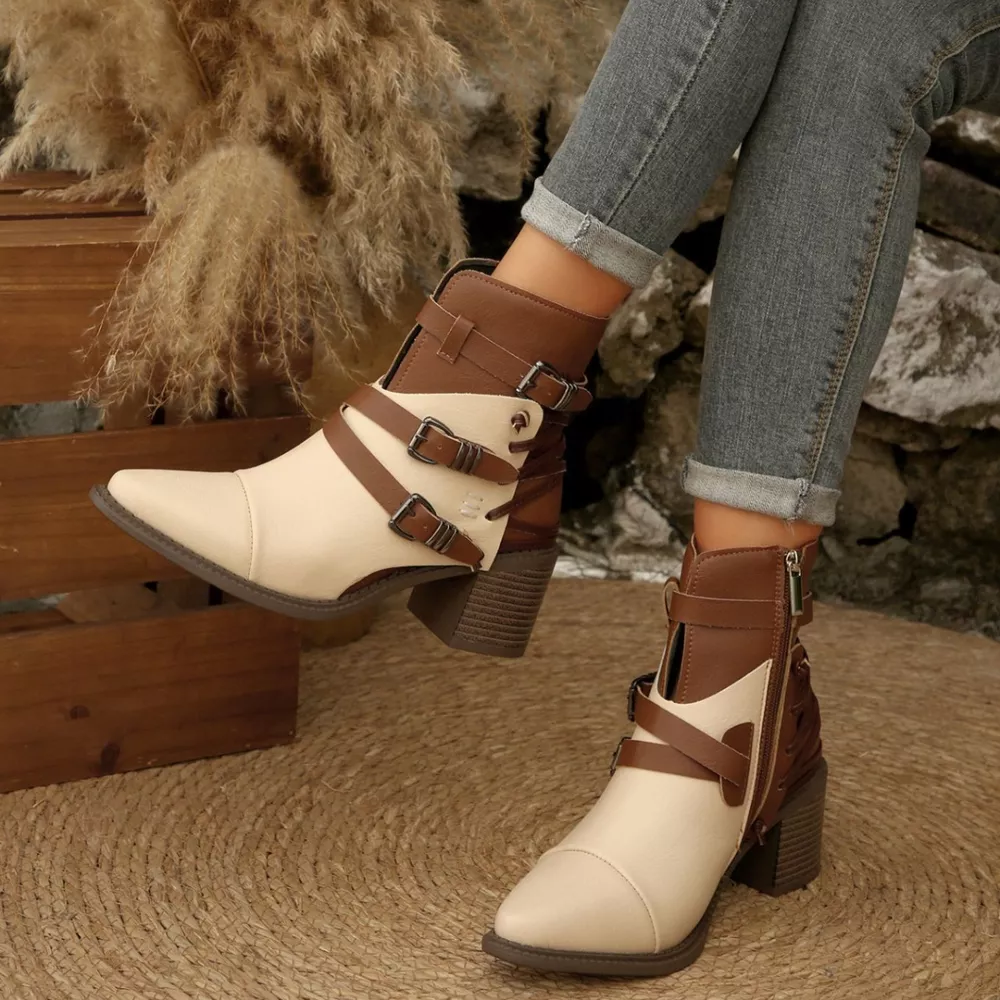 Point Toe Buckle Strap Ankle Boots with Block Heels