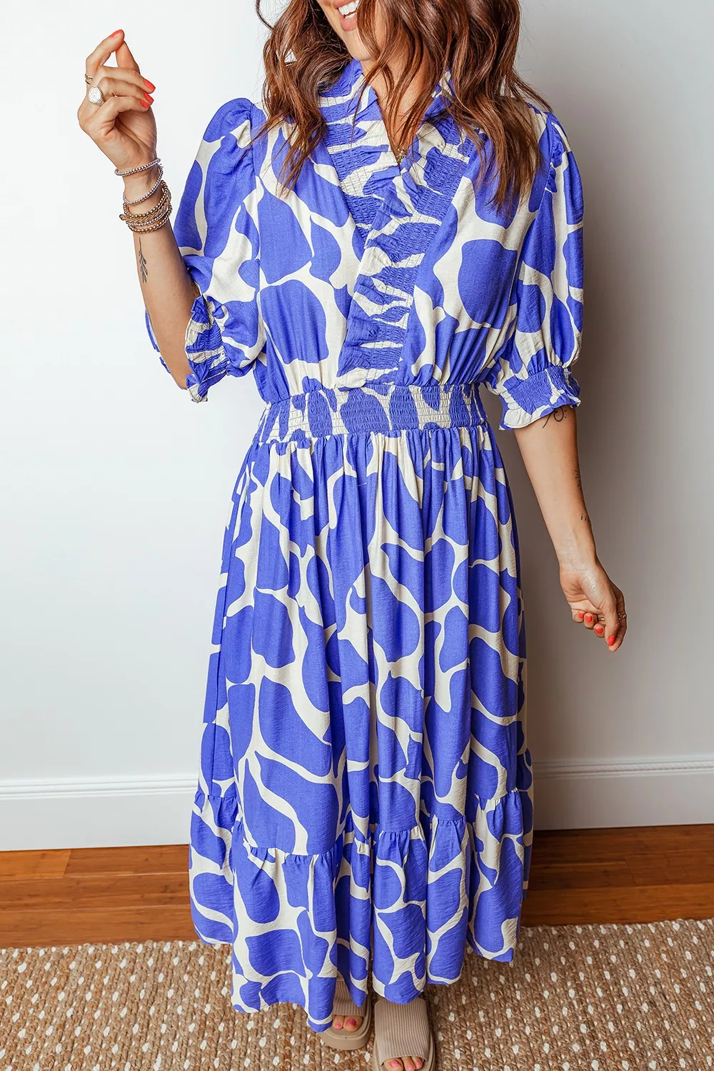 Abstract Print Smocked Waist Puff Half Sleeve Dress