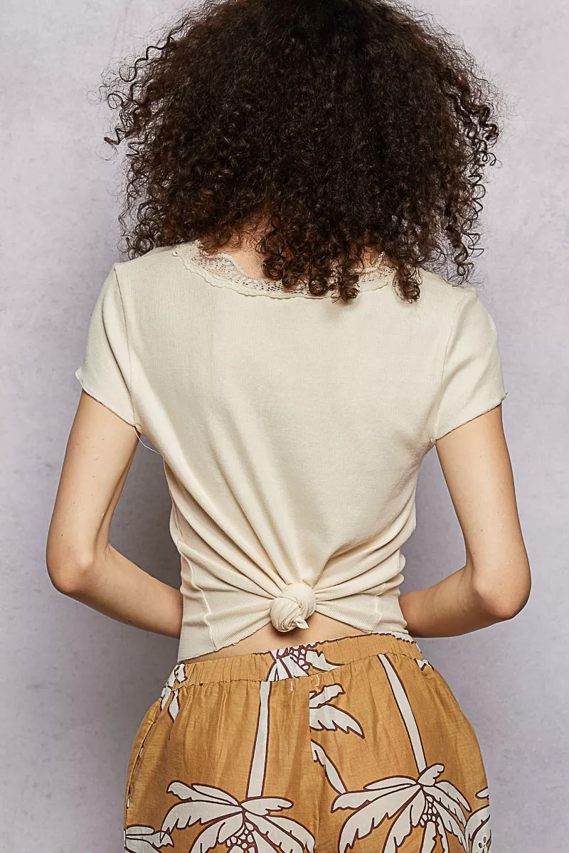 POL Round Neck Short Sleeve Crop T-Shirt with Lace Trim