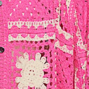 This short-sleeve shirt top is designed in crochet with a relaxed fit for a laid-back yet stylish look. The granny square pattern adds a charming and intricate detail to the design. A bold collar accent enhances the neckline and adds a touch of sophistication. The button closure provides a functional and versatile element to the top, allowing for easy wear.