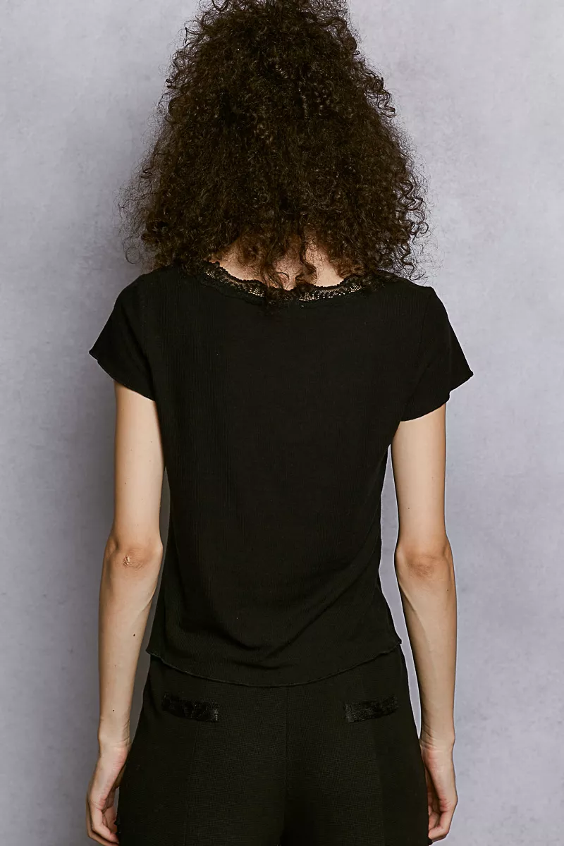 The round-neck short-sleeve ribbed basic top offers a regular fit and delicate lace detailing along the neckline for a touch of femininity. The soft merrow edging adds a subtle finishing touch to the design. Finished in a solid color with a clean, normal wash, this top exudes simplicity and elegance, perfect for an everyday look. Ideal for both casual and dressed-up occasions, this top combines comfort with style for a versatile wardrobe staple.