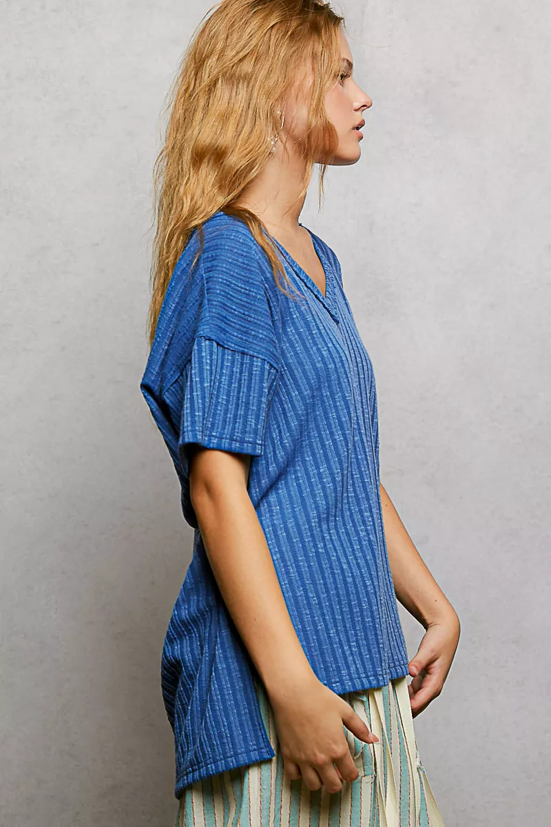POL Ribbed Knit V-Neck Short Sleeve T-Shirt with Side Slit