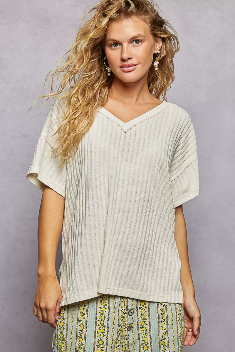 POL Ribbed Knit V-Neck Short Sleeve T-Shirt with Side Slit