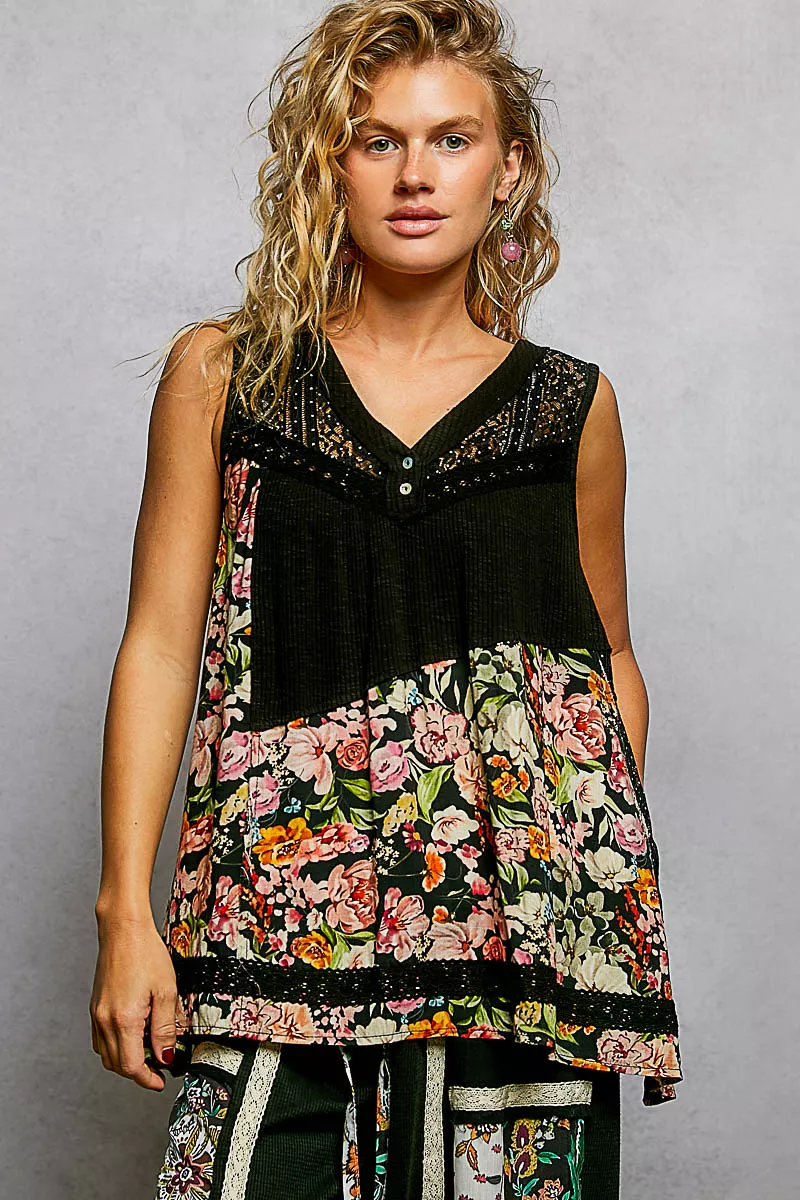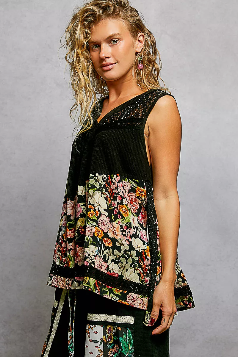 POL Lace Detail Floral V-Neck Tank