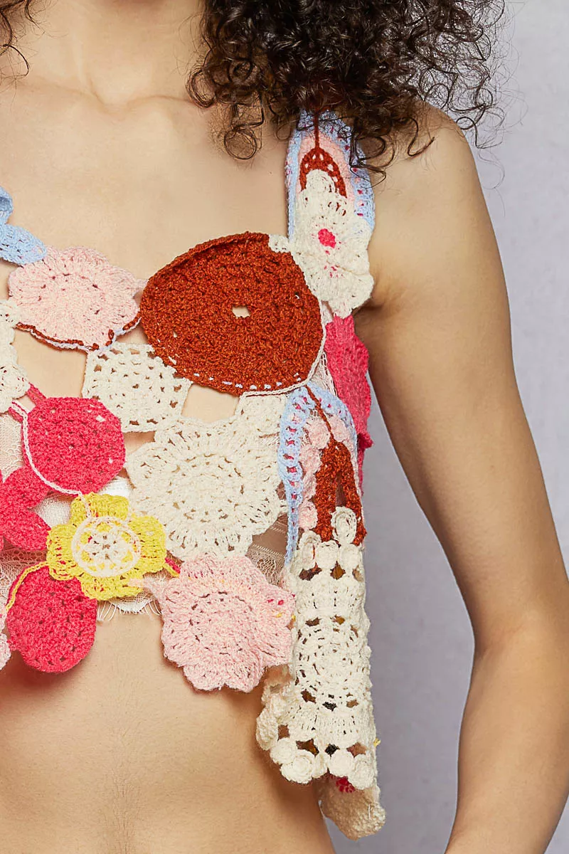 This sleeveless top is beautifully designed with a heart neckline and a relaxed fit. It features intricate crochet work with various motif weaves and a V-shaped bottom opening. The garment is hand-made with a multi-pattern design, adding a unique and artistic touch to the overall look.